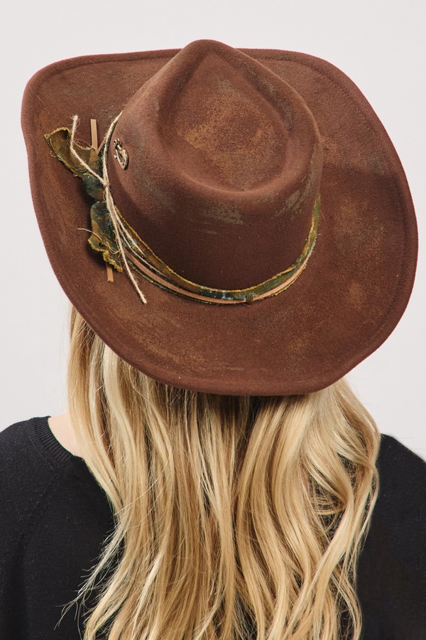 - * This is a Vintage Versatile Shapeable Cowgirl & Fedora Hat With Distressed Fabric & Suede Band from H&D Accessories. It features a weathered suede band paired with a textured fabric band, along with a decorative metal accent and tied details, giving it a unique rustic vintage look. The shapeable design allows you to customize its style. It's perfect for adding a retro touch to your outfits, suitable for casual outings, festivals, or when you want to elevate your daily style.