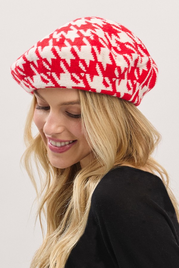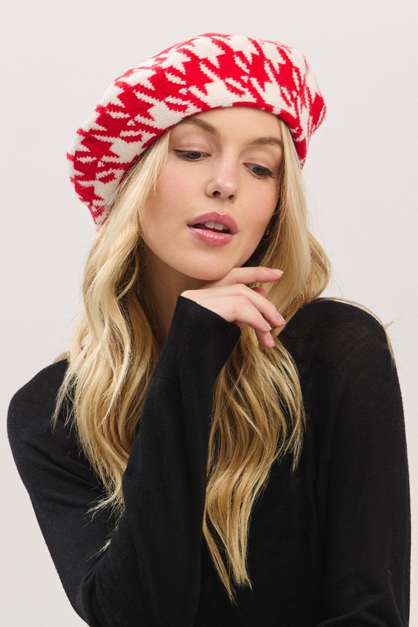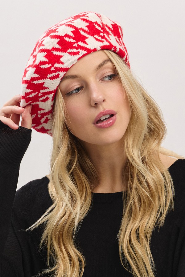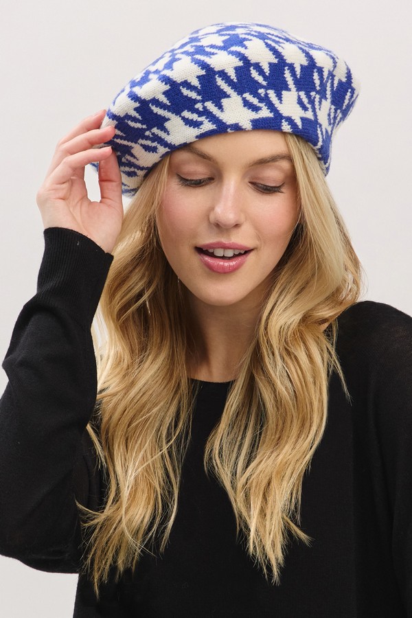 - * This is a Houndstooth Knit Beret from H&D Accessories. It has a classic beret shape, crafted with a knitted houndstooth pattern. The beret sits on the head, showcasing a textured and stylish design that adds a touch of elegance to the overall look.