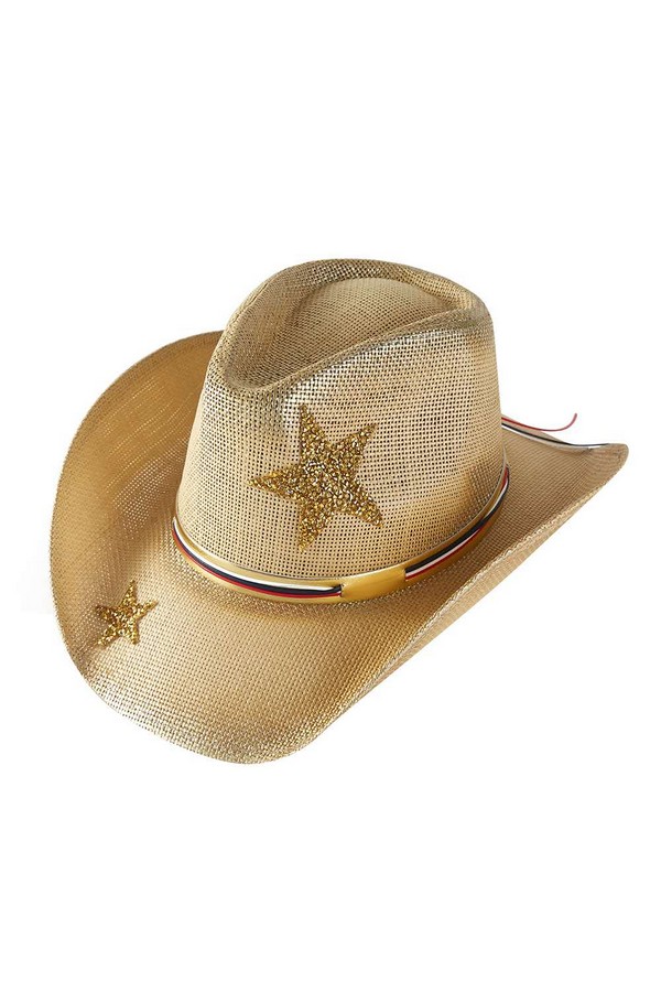 - * This is a Glitter Star Cowboy Hat from H&D Accessories. It has a classic cowboy hat shape, adorned with glittery star decorations. There's a band around the crown, adding a stylish detail. The hat's design combines the traditional cowboy silhouette with eye - catching star embellishments.