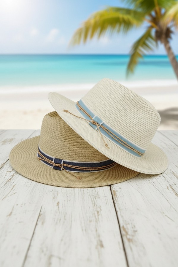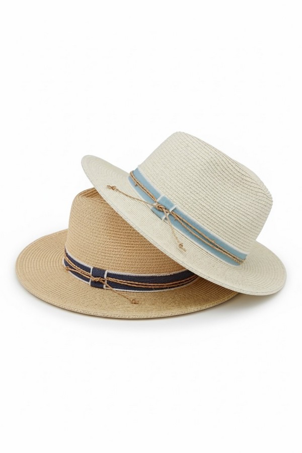 - * This is the Straw Fedora Hat With Contrast Ribbon And Braided Cord Detail from H&D Accessories, a finely woven straw hat accented by a distinct ribbon band paired with a braided cord that ties into a subtle knot, adding a polished decorative touch. It’s perfect for a daytime outdoor event—whether you’re heading to a beach picnic or a casual garden gathering, the hat offers both style and sun protection, with its textured weave and detailed band complementing light, summery outfits. It also works well for a weekend stroll through a coastal town, merging its classic fedora silhouette with thoughtful decorative elements for a put-together, relaxed look.