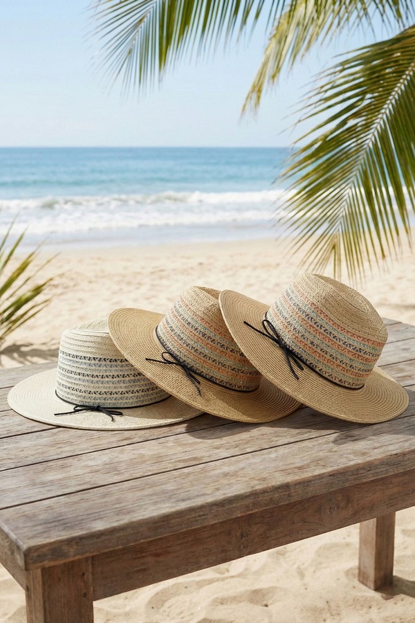 - * This is the Multicolor Woven Straw Fedora Hat With Ribbon Band from H&D Accessories, a textured straw hat accented by a detailed woven band featuring repeating patterned motifs, paired with a thin ribbon band that ties into a small bow for a polished touch. It’s perfect for a casual outdoor gathering—whether you’re attending a park picnic or a daytime festival, the hat adds a stylish layer of sun protection while its decorative bands complement light, summery attire. It also works well for a weekend shopping trip, merging its classic fedora silhouette with the intricate woven and ribbon details for a put-together, relaxed look.