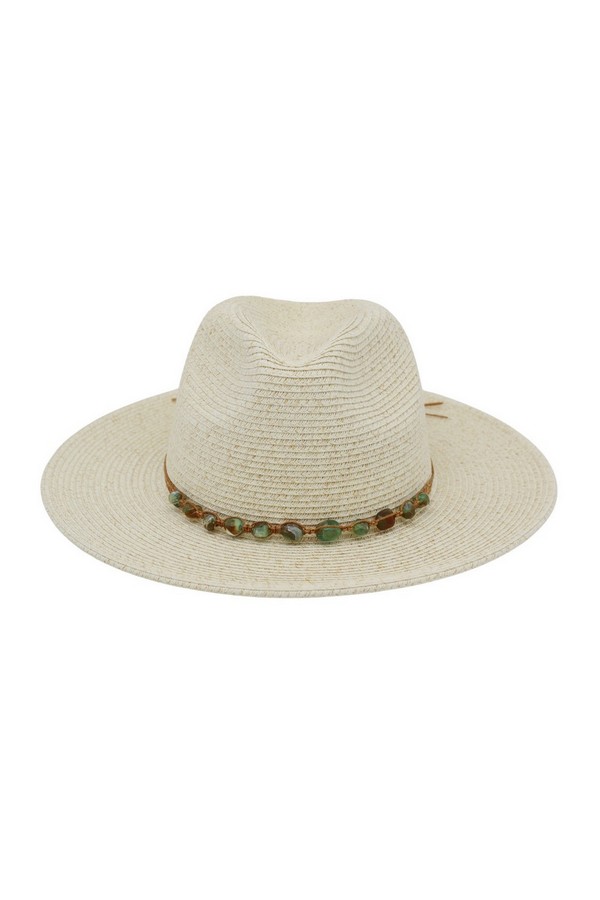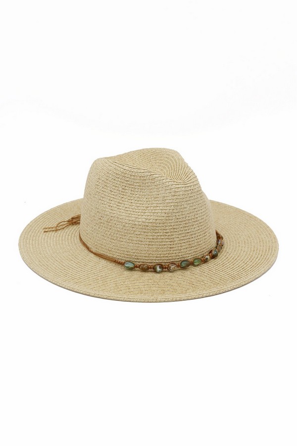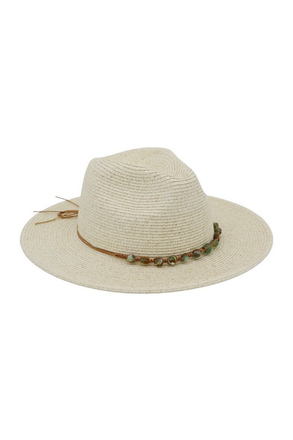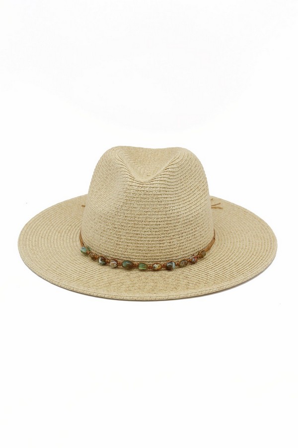 - * This is the Straw Fedora Hat With Turquoise Stone Band from H&D Accessories, a finely woven straw hat adorned with a delicate band strung with smooth stone accents, plus a subtle tassel detail that adds a relaxed, decorative touch. It’s perfect for a coastal day trip—you can wear it while exploring a boardwalk or lounging by the shore, with the stone-adorned band bringing a subtle, polished flair to your casual outfit. It also works well for an outdoor café visit, merging its classic fedora silhouette with the understated stone accents for a stylish, sun-protective accessory that fits laid-back summertime moments.