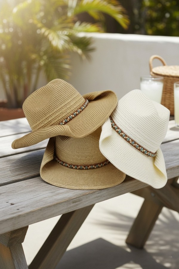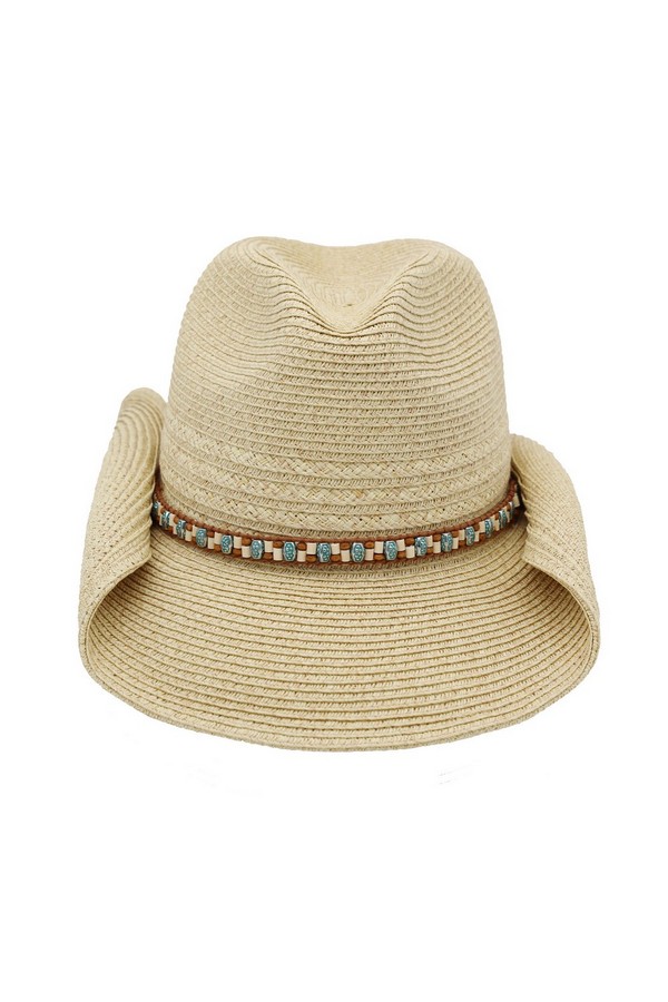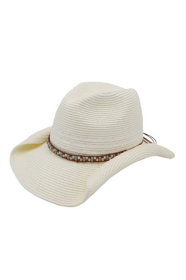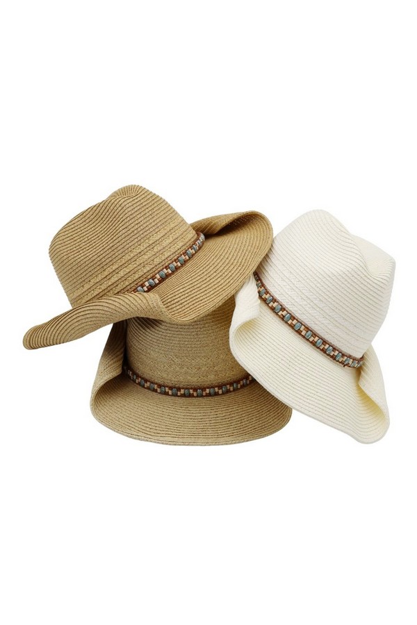 - * This is the Straw Cowboy Hat With Multicolor Beaded Band from H&D Accessories, a textured straw hat accented by a vibrant beaded band that wraps around the crown, paired with a subtle tie detail that adds a relaxed, decorative touch. It’s perfect for a country-style outdoor event—you can wear it while attending a farmers’ market or a casual picnic, with the beaded band bringing a playful, summery flair to your outfit. It also works well for a daytime hike, merging its classic cowboy silhouette with the colorful beaded accent for a stylish, sun-protective accessory that fits laid-back outdoor activities.