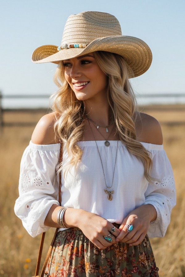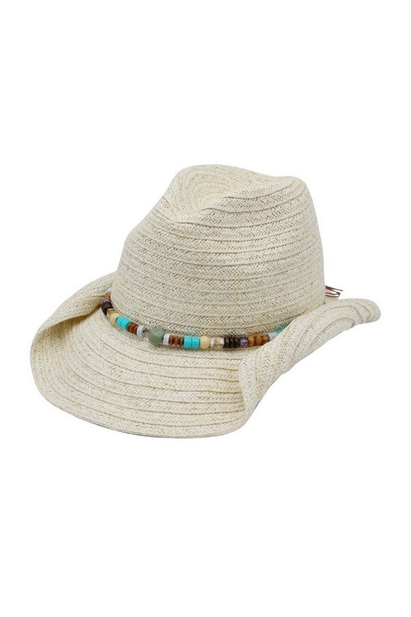 - * This is the Straw Cowboy Hat With Stone & Woods Beads from H&D Accessories, a textured straw hat adorned with a band strung with mixed stone and wood beads, plus a subtle metal detail that adds a refined decorative touch. It’s perfect for a rustic outdoor gathering—you can wear it while visiting a farm stand or joining a casual backyard barbecue, with the bead-adorned band bringing a natural, earthy flair to your outfit. It also works well for a daytime trail walk, merging its classic cowboy silhouette with the organic bead accents for a stylish, sun-protective accessory that fits laid-back outdoor moments.