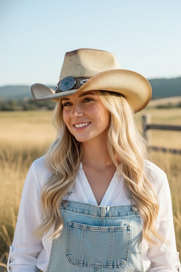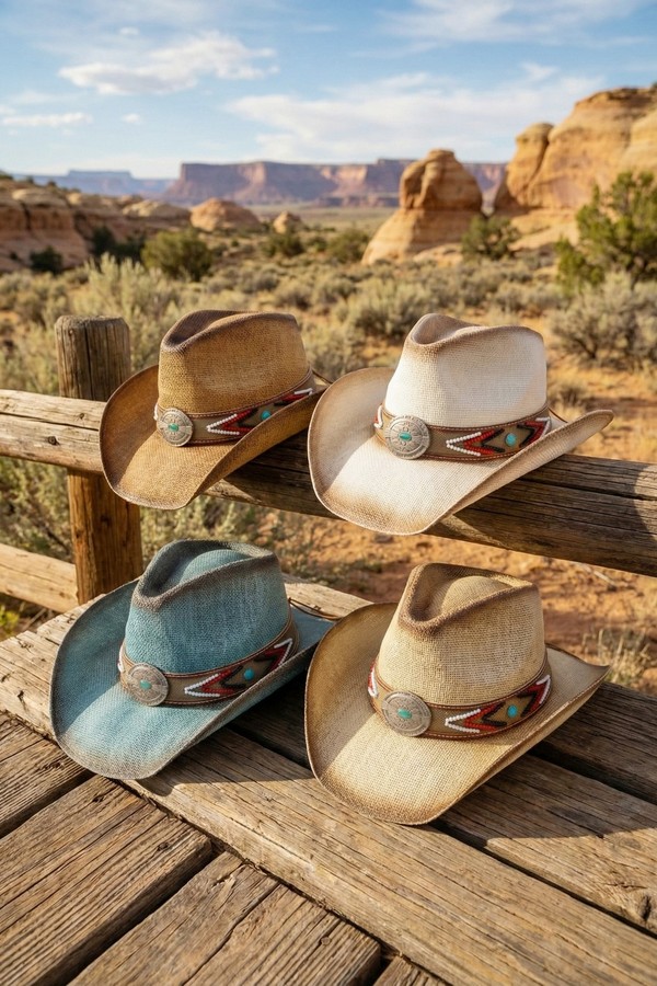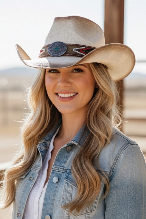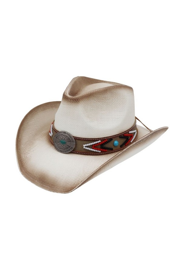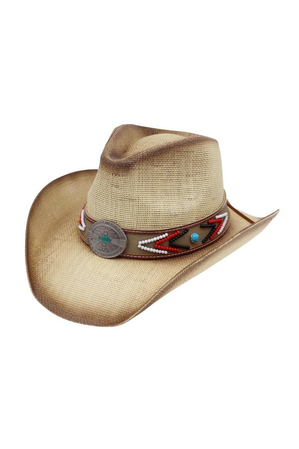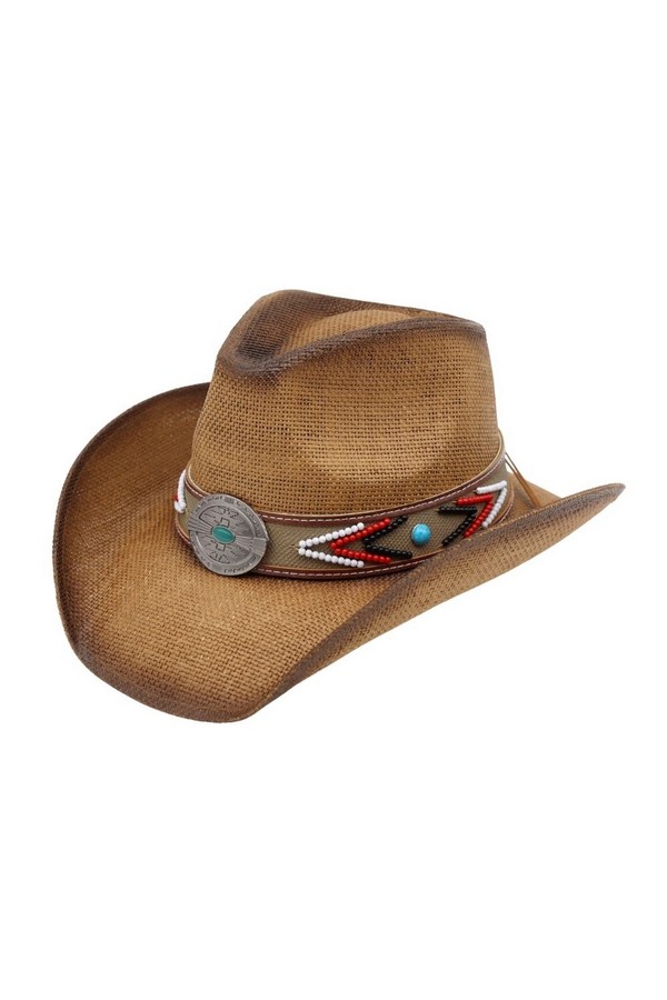 - * This Vintage Western Straw Hat With Beaded Band & Turquoise Concho from H&D Accessories is crafted from breathable woven straw, detailed with a decorative beaded band and a polished concho accent for an authentic retro-inspired look. Its wide, curved brim offers reliable shade from the sun, making it a stylish and functional choice for outdoor music festivals, ranch visits, or casual summer hikes.