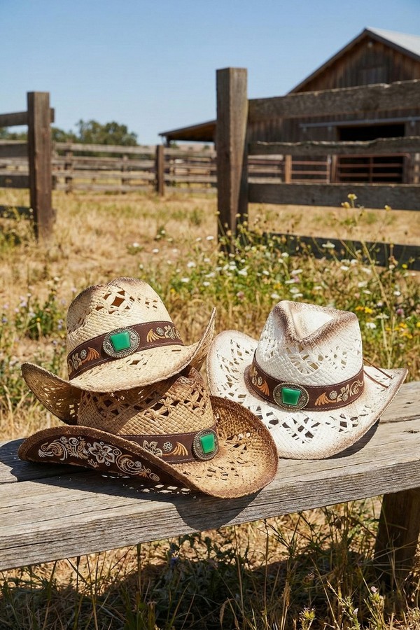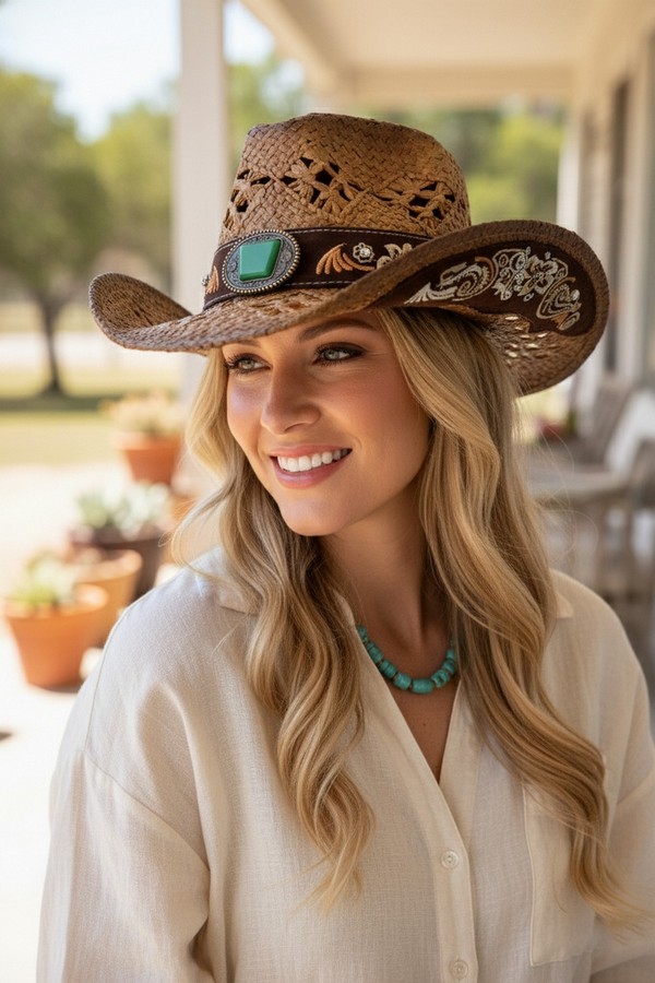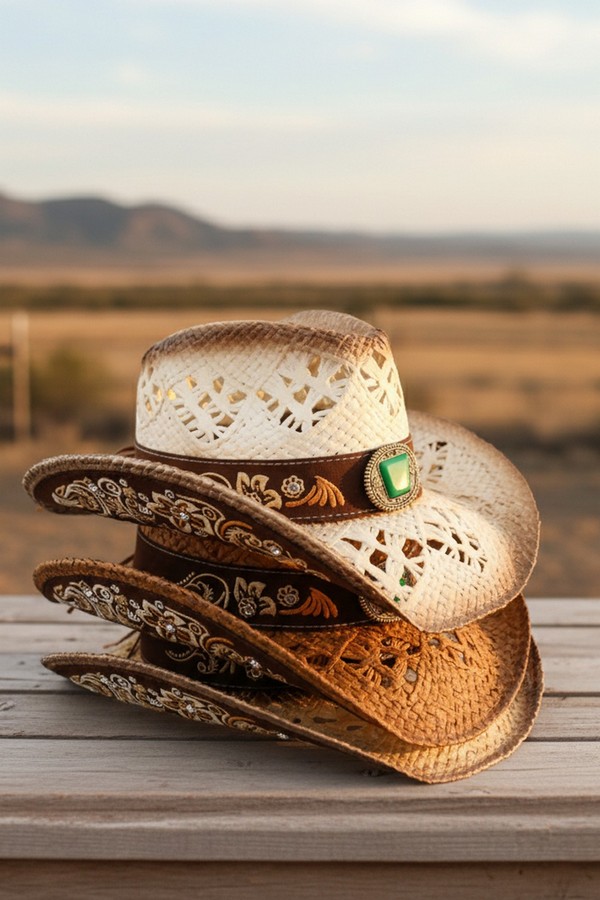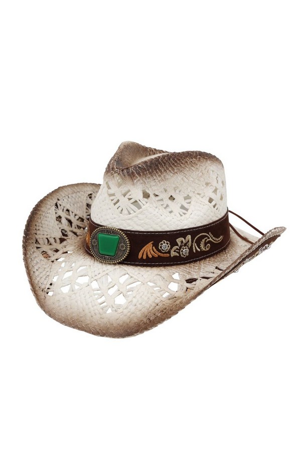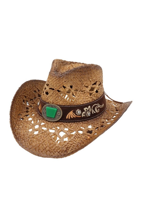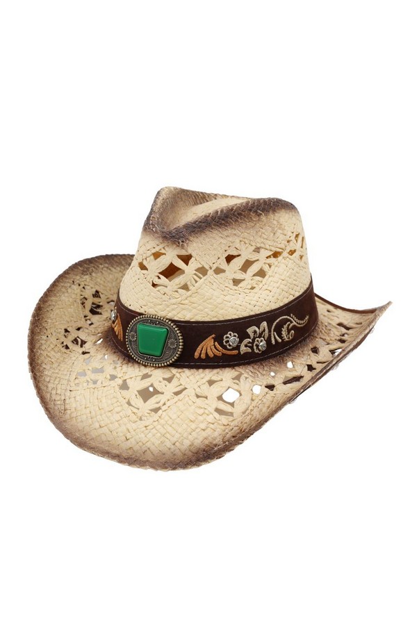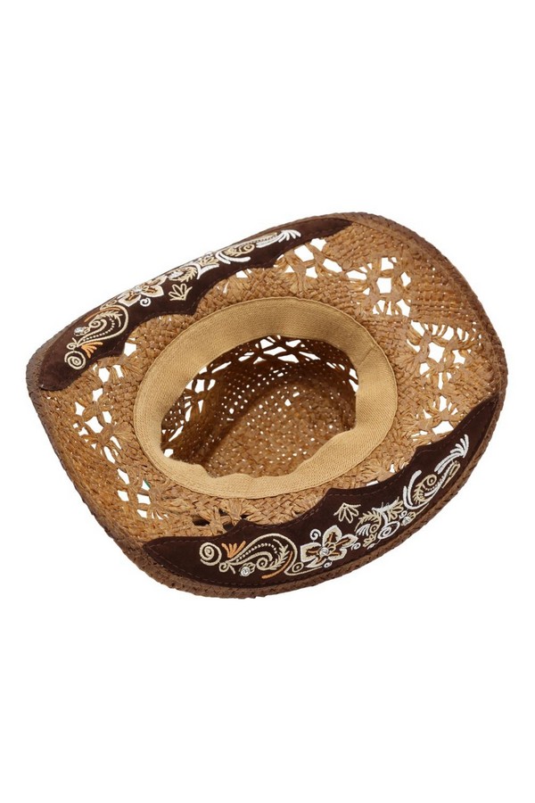 - * This Vintage Western Straw Hat With Cutout Vents, Underside Pattern, Floral Embroidery And Rhinestone from H&D Accessories is crafted from breathable woven straw, featuring cutout vents for airflow, intricate underside detailing, and a decorative band with floral embroidery and sparkling rhinestones. Its wide, curved brim provides excellent sun protection, making it a stylish and practical choice for country concerts, trail rides, or sunny outdoor events.