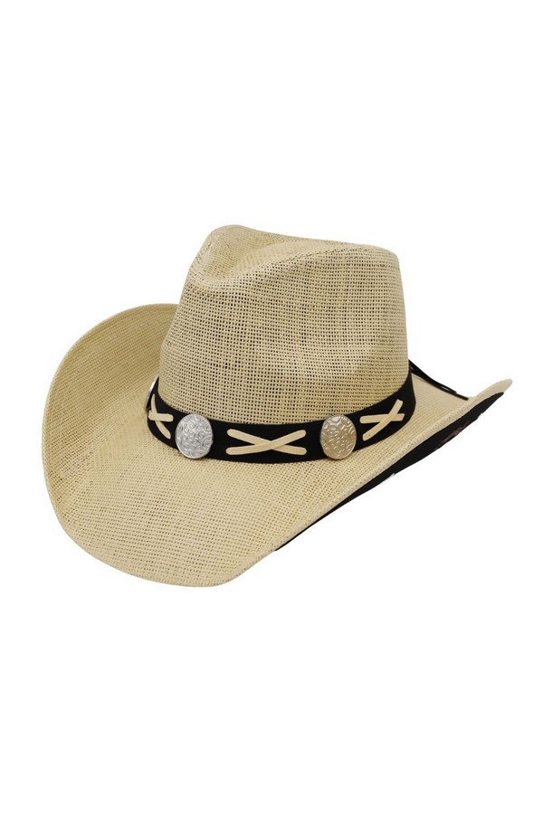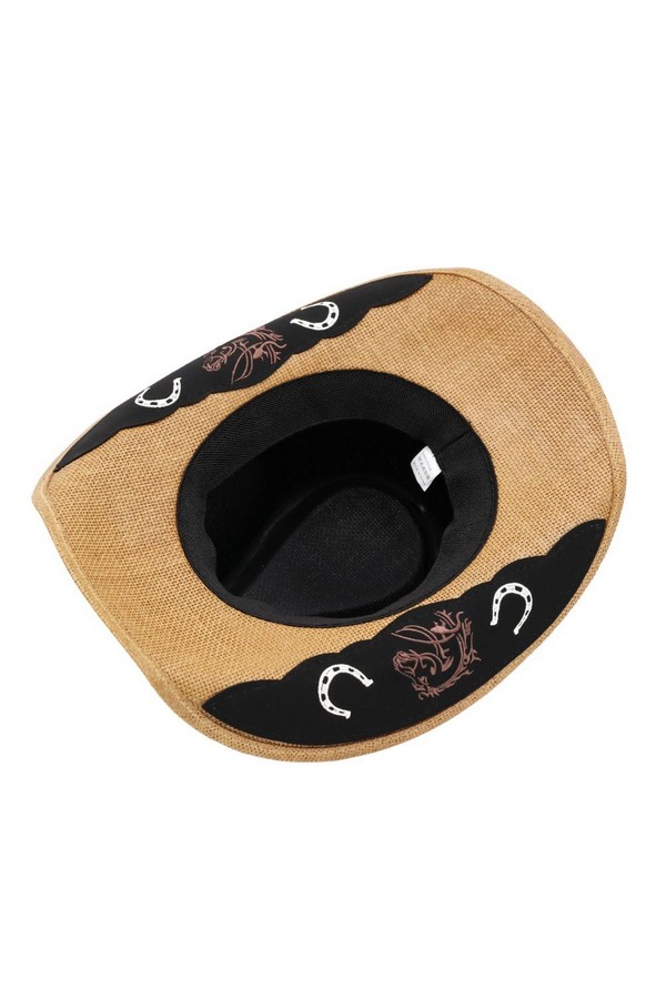 - * This Under-Brim Horse & Horseshoe Print Western Hat With X-Lace And Conchos from H&D Accessories is crafted from breathable straw, featuring a decorative band with x-lace detailing and polished conchos, plus a fun under-brim print. Its wide, curved brim delivers dependable sun protection, making it a stylish and practical choice for poolside relaxation, beach days, or outdoor country-themed events.
