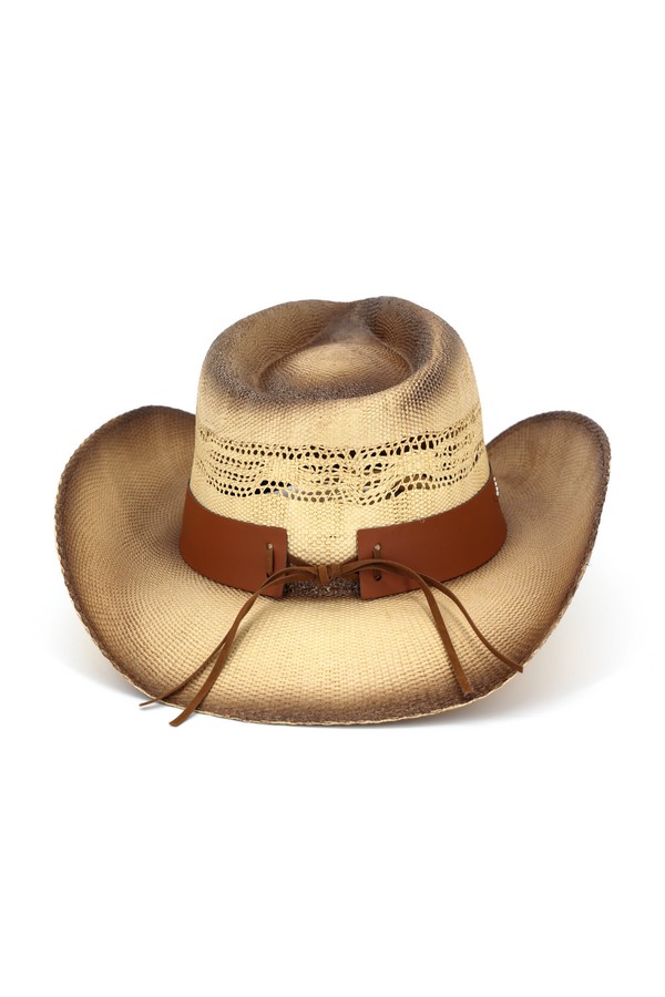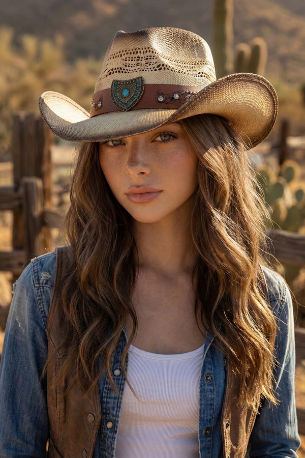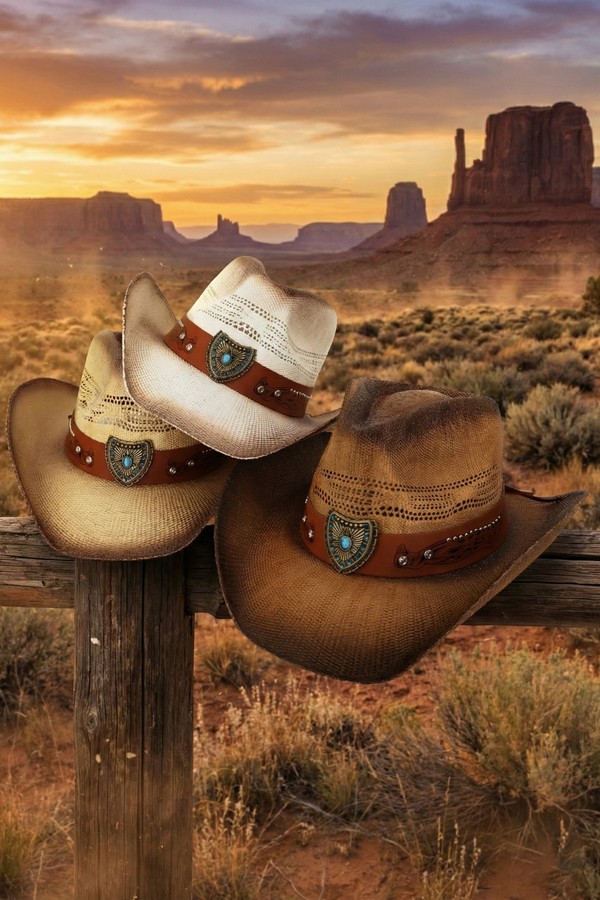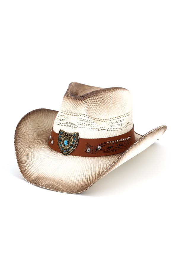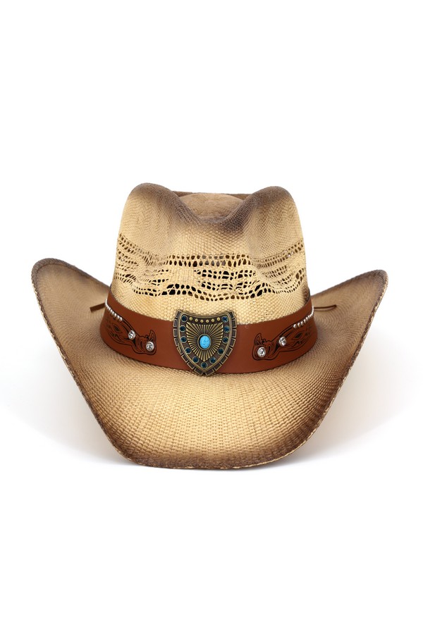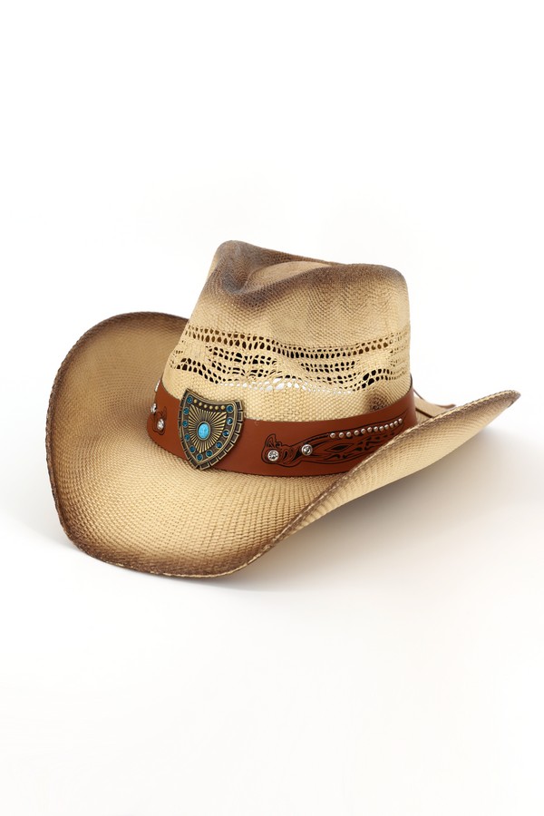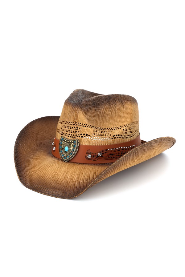 - * This Vented Vintage Cowboy Straw Hat With "The Aztec Shield" Turquoise Concho, from H&D Accessories, is crafted with breathable woven straw and delicate openwork venting along the crown for optimal airflow, paired with a textured leather hatband adorned with embossed details, metallic studs, and the striking "The Aztec Shield" concho that showcases intricate metal craftsmanship. Its gently faded, vintage finish enhances the classic Western silhouette, while the wide, curved brim offers practical coverage for sunny days. This hat is a perfect blend of rustic charm and functional design, ideal for rodeos, outdoor festivals, or casual country-style outings.