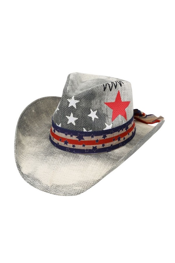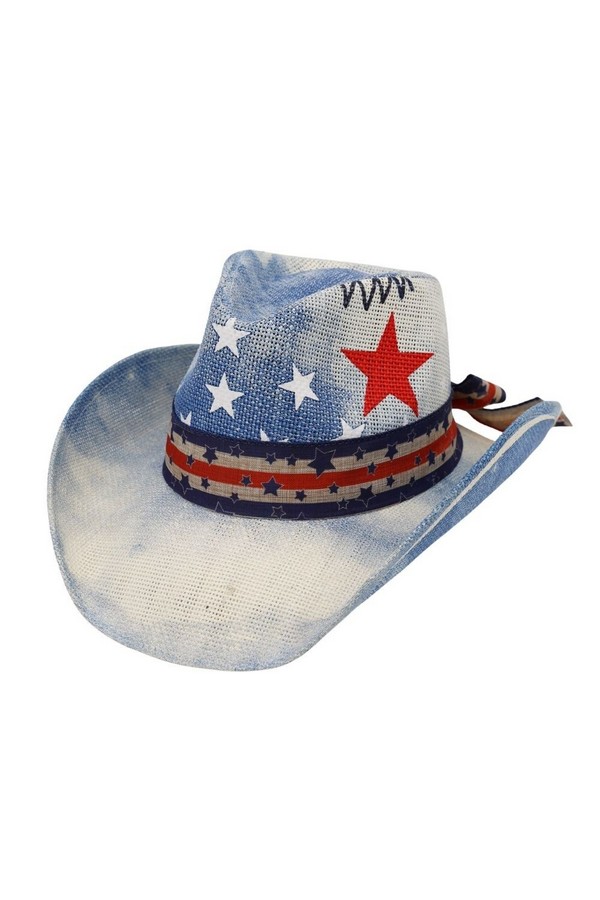 - * This American Stars & Stripes Cowboy Straw Hat from H&D Accessories is made of lightweight, breathable straw, decorated with a patriotic star pattern and a striped band for a bold, festive look. Its wide, curved brim offers reliable sun protection, making it a perfect pick for Fourth of July celebrations, outdoor parades, or casual summer barbecues.