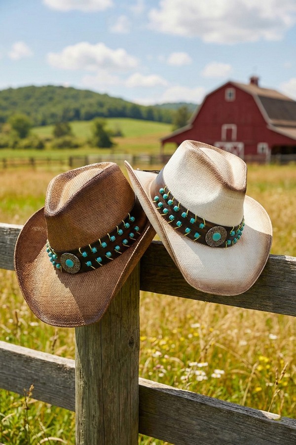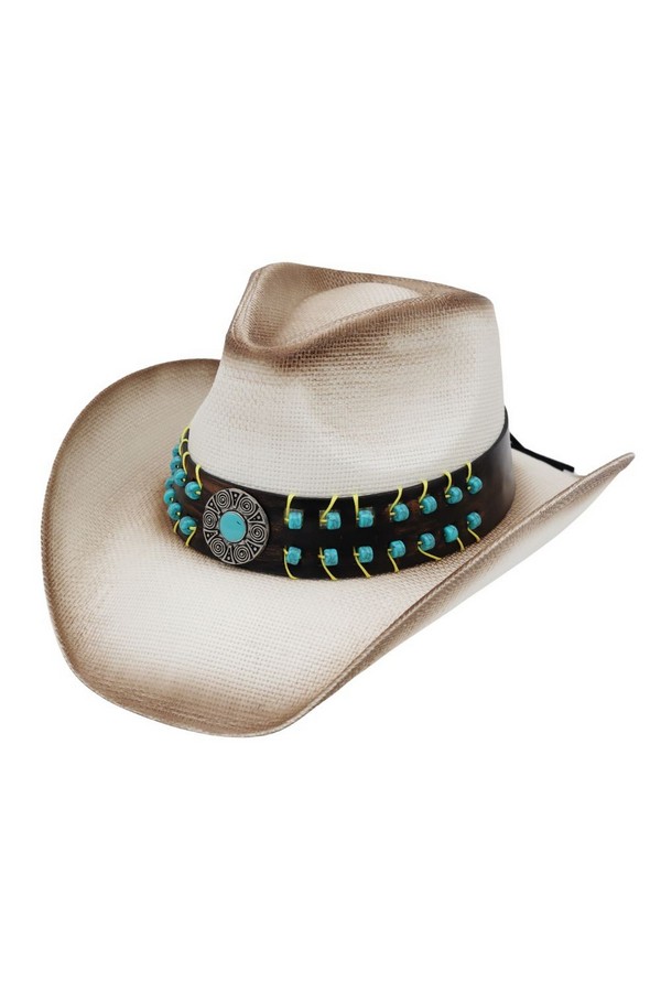 - * This Vintage Turquoise Beaded Straw Cowboy Hat With Antiqued Concho from H&D Accessories is crafted from lightweight, breathable straw, detailed with a decorative band featuring beaded accents and an antiqued concho for a rustic, vintage-inspired finish. Its wide, curved brim offers dependable sun protection, making it a stylish and practical companion for outdoor rodeos, country concerts, or casual summer hikes.