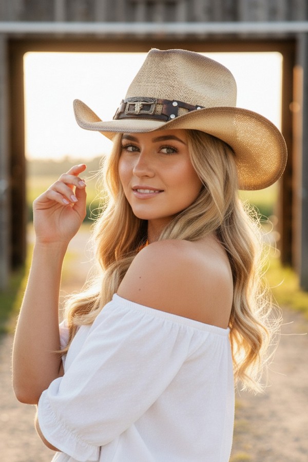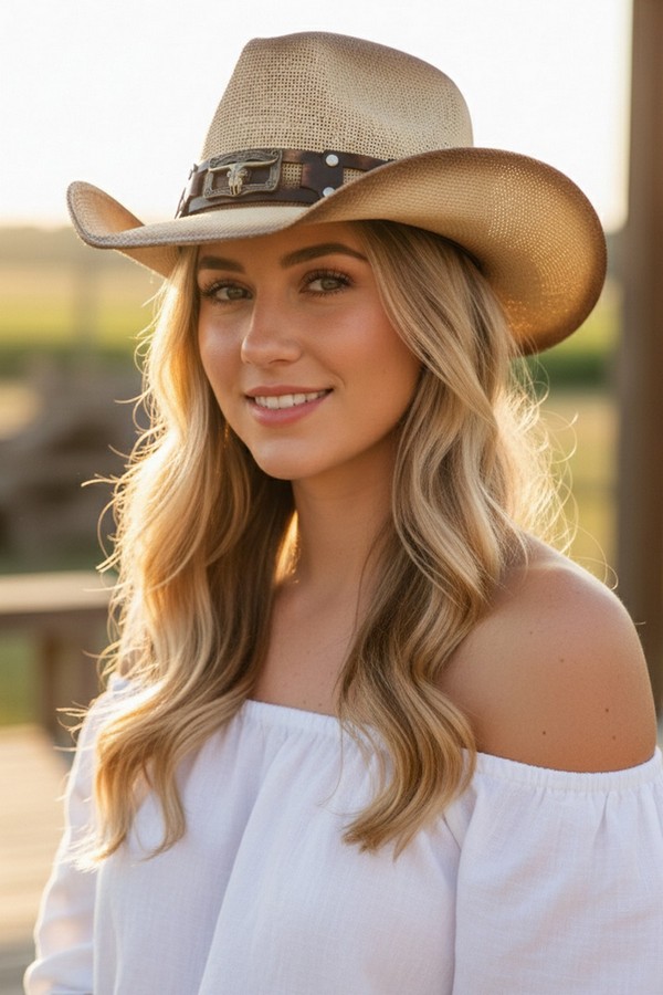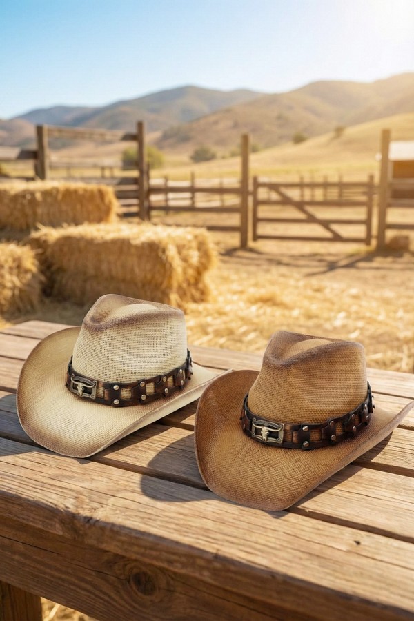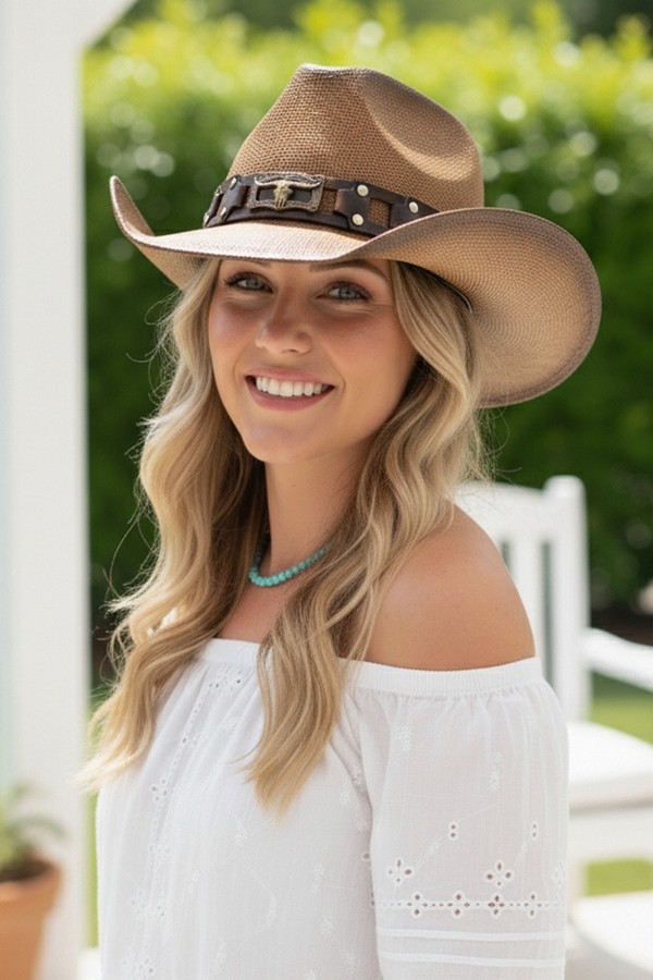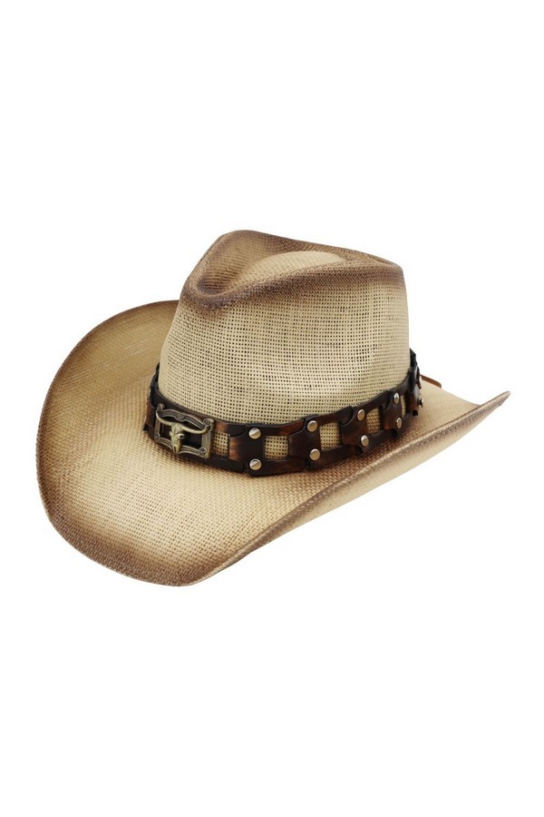 - * This Rugged Studded Band Cowboy Hat With Longhorn Buckle from H&D Accessories is crafted from breathable woven straw, detailed with a rugged studded leather band and a bold longhorn buckle for a tough, Western-inspired look. Its wide, curved brim offers reliable sun protection, making it a stylish and practical choice for outdoor rodeos, country concerts, or casual weekend trail rides.