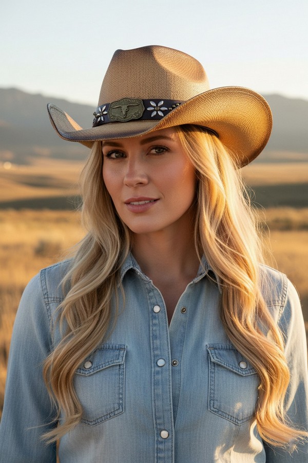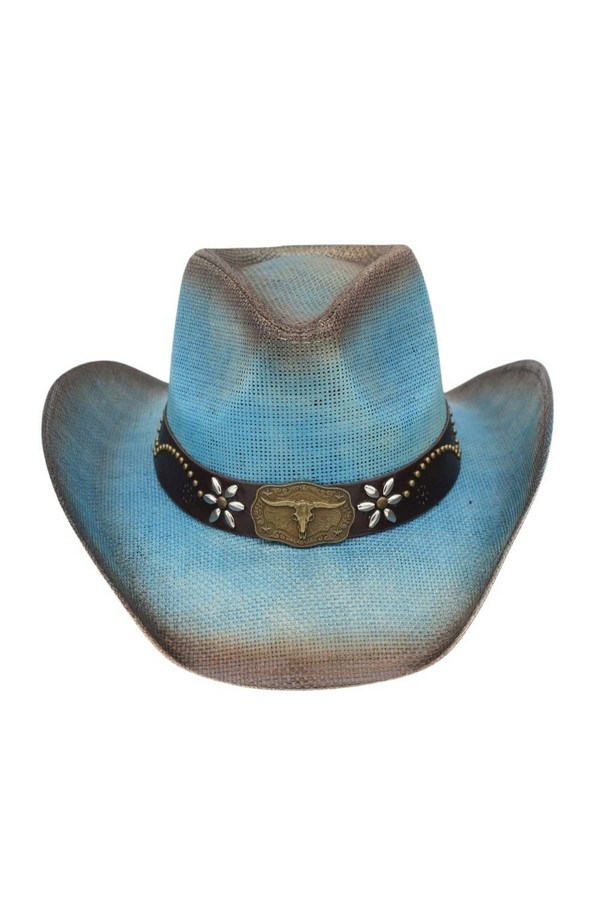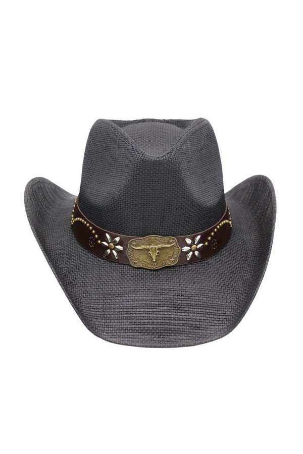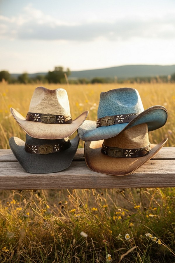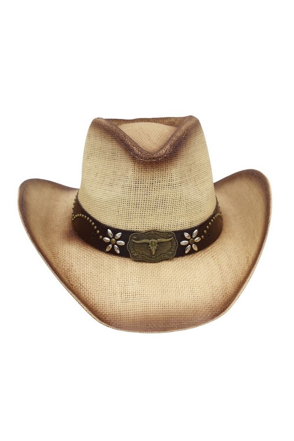 - * This is the Distressed Straw Cowboy Hat With Metal Bull Buckle from H&D Accessories, a textured distressed straw hat adorned with a band featuring a prominent metal bull buckle, paired with decorative floral details and small stud accents along the strap. It’s perfect for a rustic outdoor event—you can wear it while attending a country music concert or a casual ranch-style picnic, with the metal bull buckle and studded band bringing a rugged, western flair to your outfit. It also works well for a daytime trail hike, merging its laid-back distressed silhouette with the bold decorative elements for a stylish, sun-protective accessory that fits outdoor adventures.