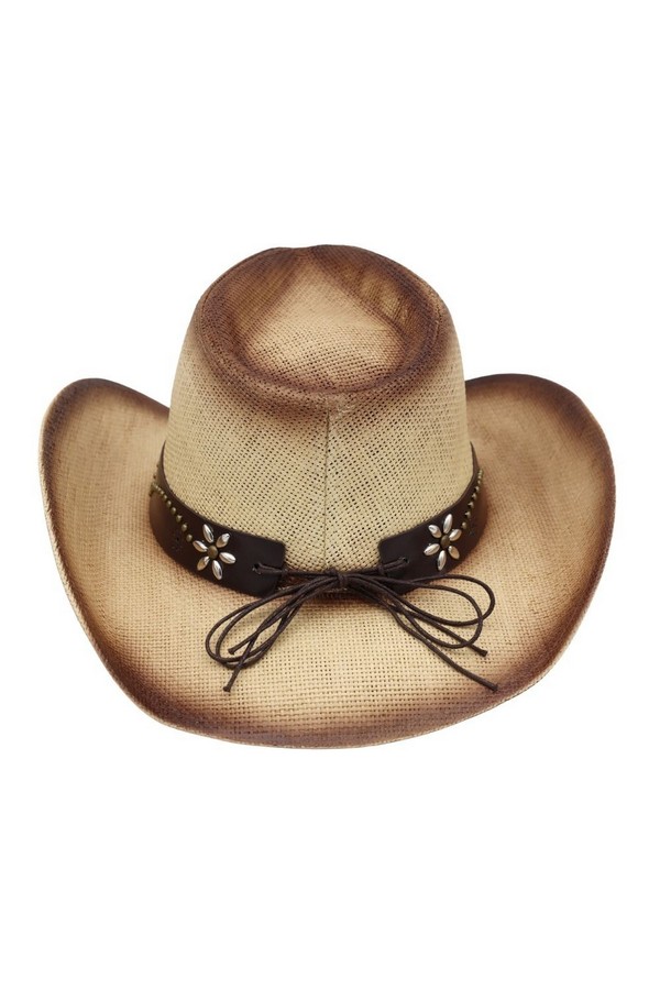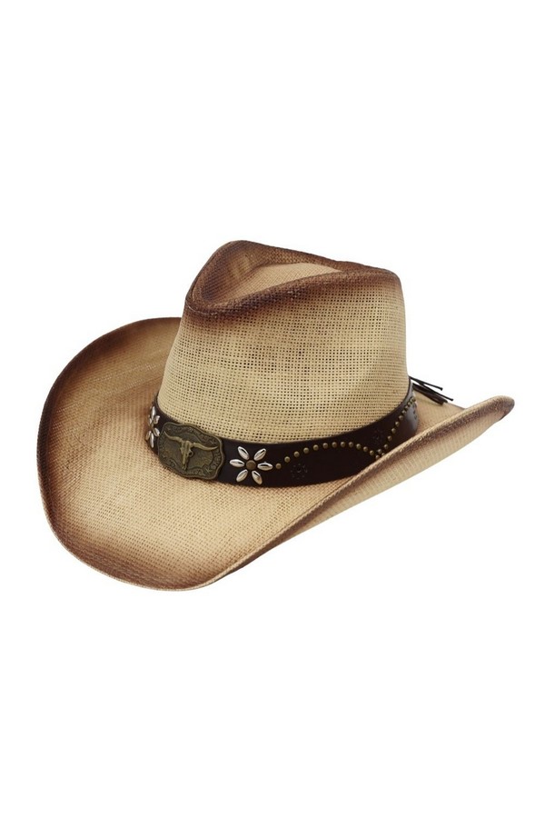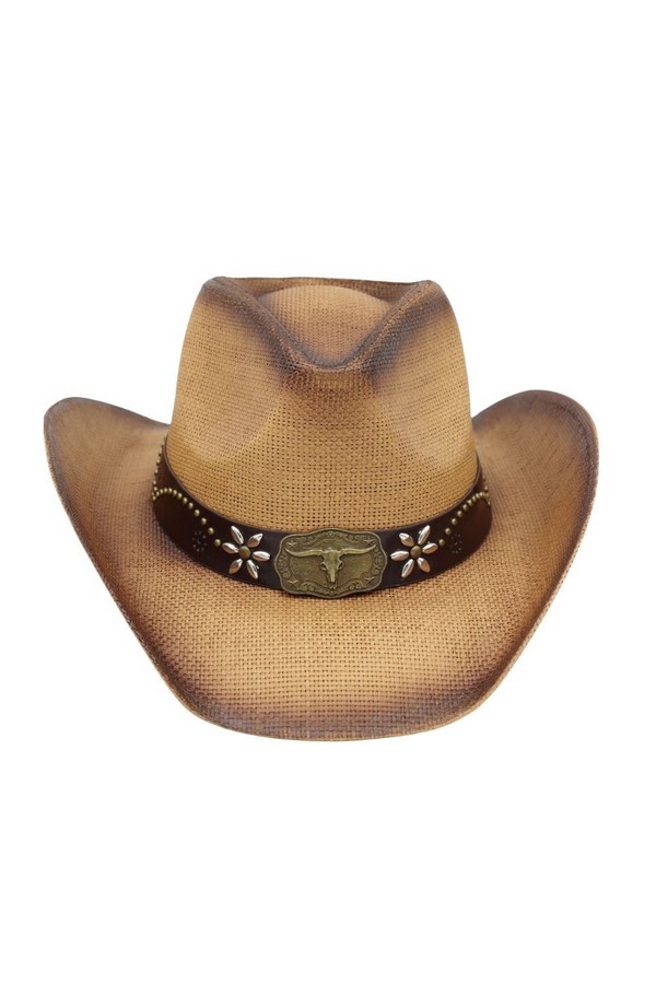 - * Distressed Straw Cowboy Hat With Metal Bull Buckle