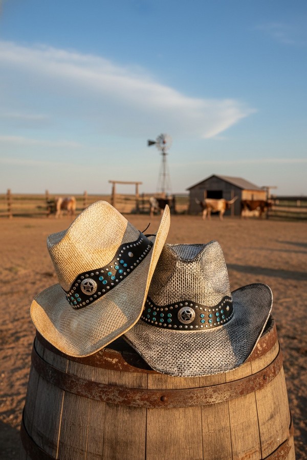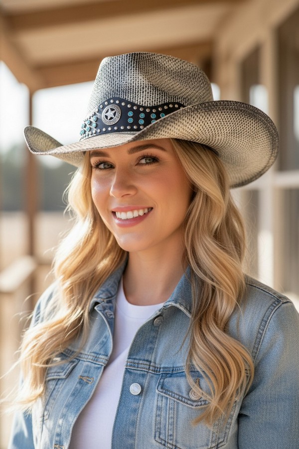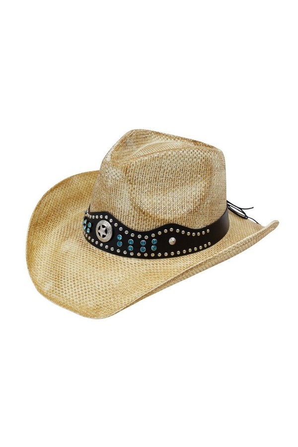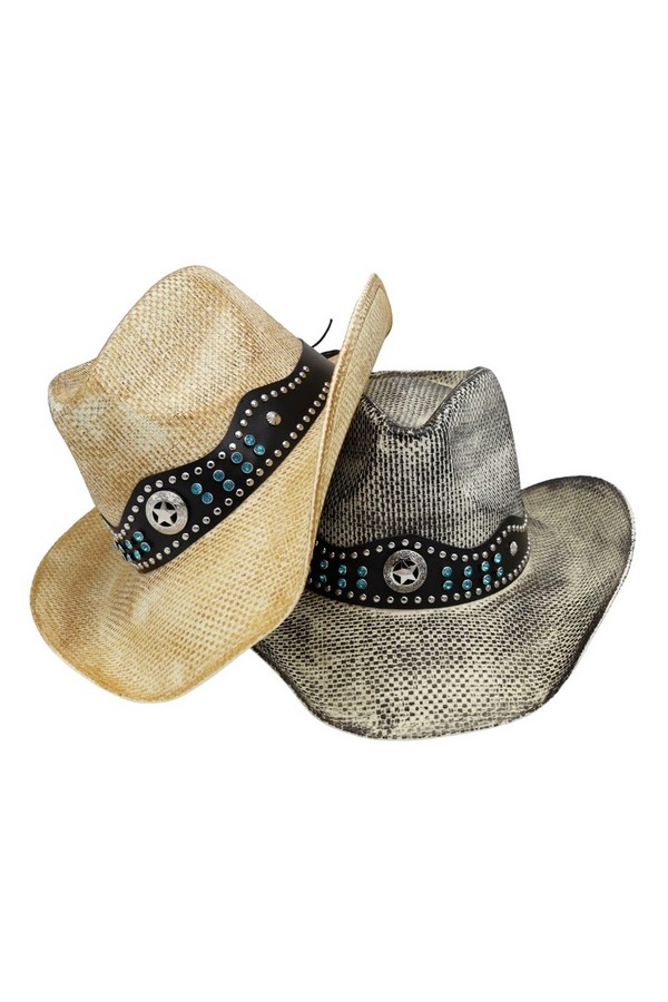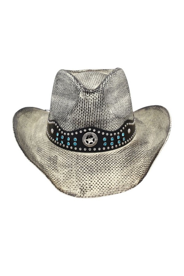 - * This Rustic Straw Cowboy Hat With Silver And Turquoise Studs Faux Leather Band (From H&D Accessories) is made of woven straw, shaped into a classic cowboy silhouette with a structured crown and curved brim. It features a faux leather band: decorated with silver studs, turquoise accents, and a central star detail, pairing the hat’s rustic texture with Western-themed decorative elements for a distinct style.