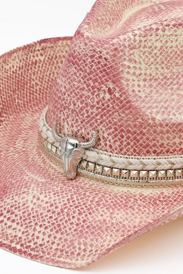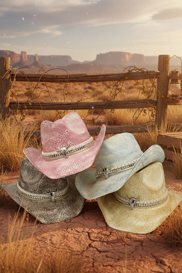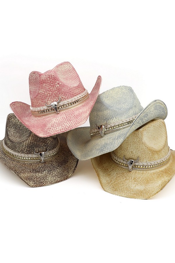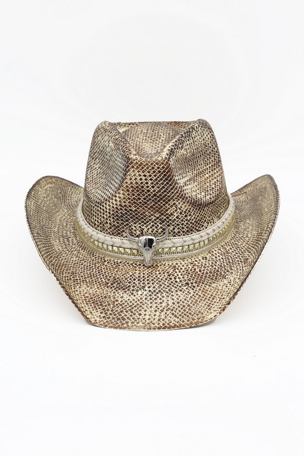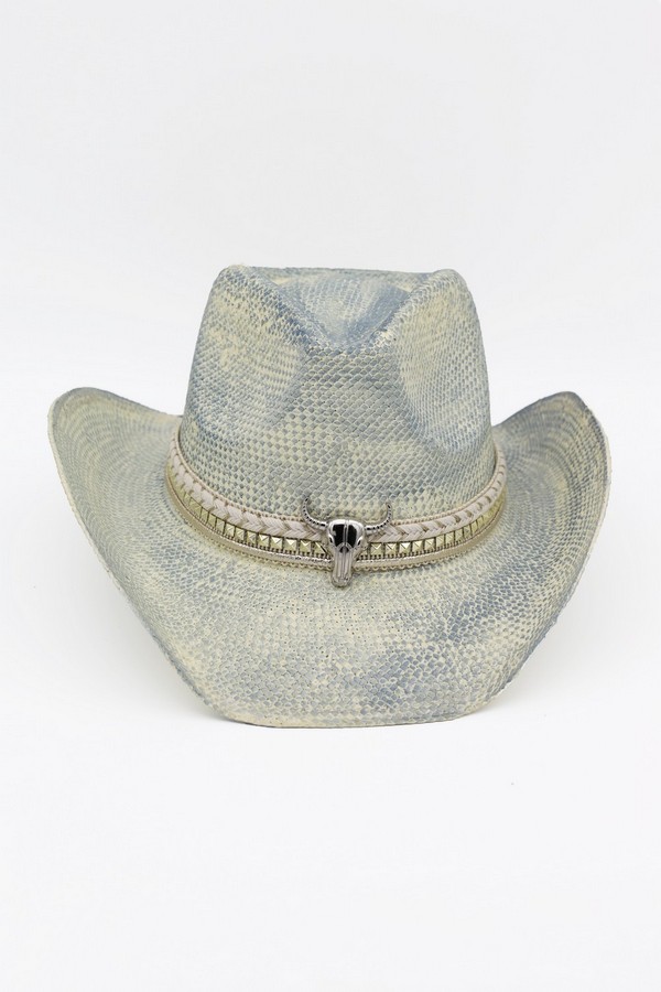 - * This Handmade Vintage Cowboy Hat With Silver Bull Head And Multiple Bands (From H&D Accessories) is crafted from textured woven material, shaped into a classic cowboy silhouette with a structured crown and curved brim. It features layered bands: a braided style paired with a decorative trim, accented by a prominent silver bull head detail at the front, enhancing its artisanal, retro Western aesthetic.