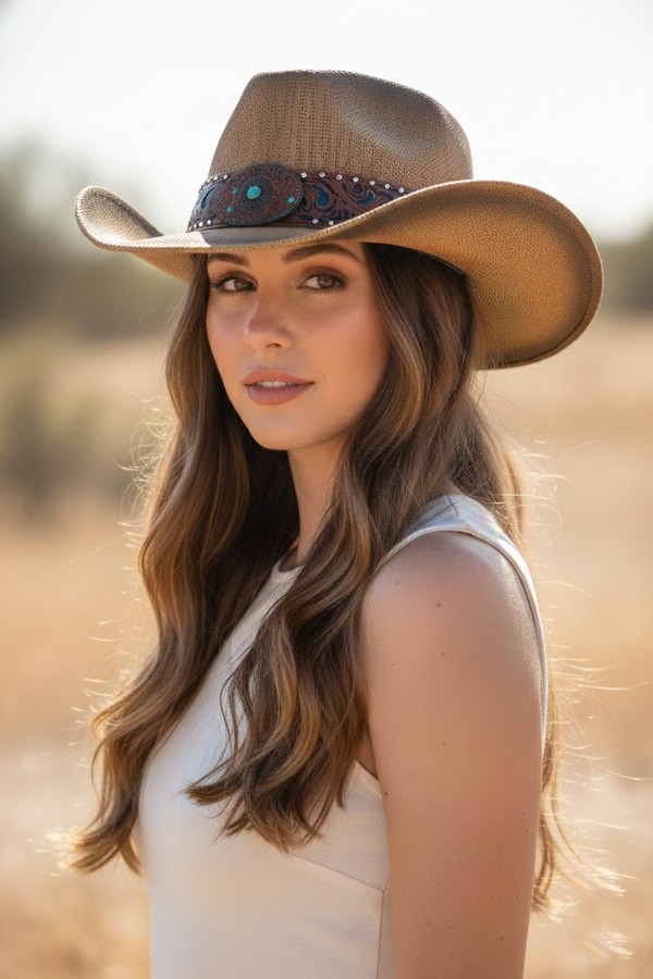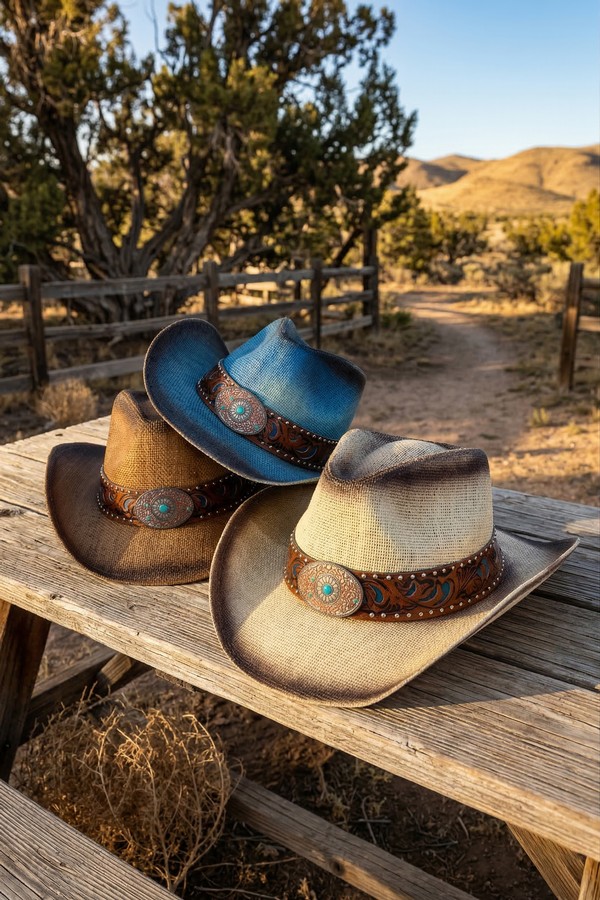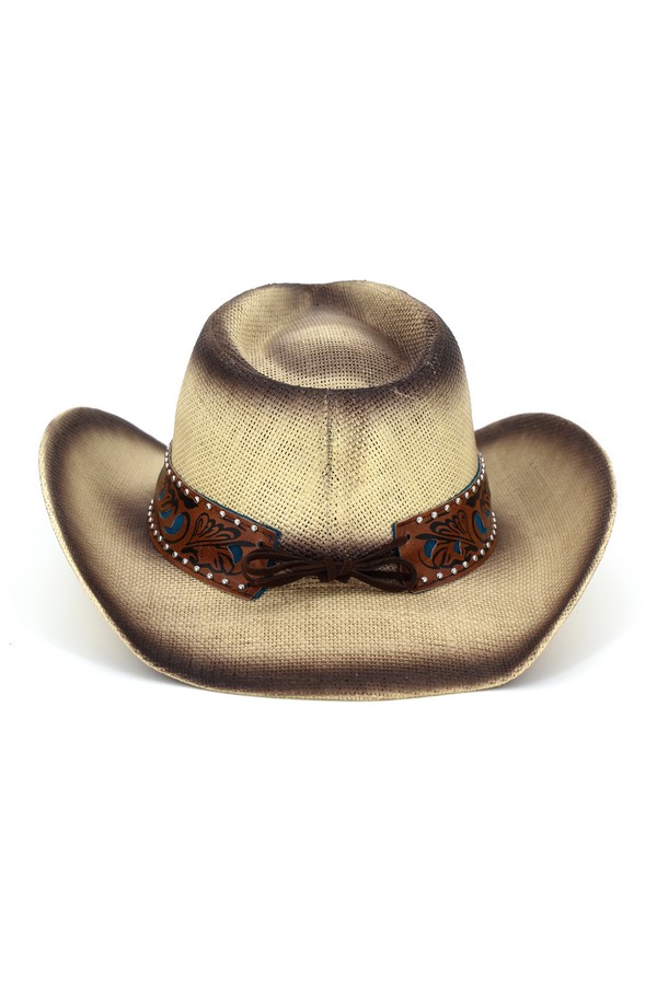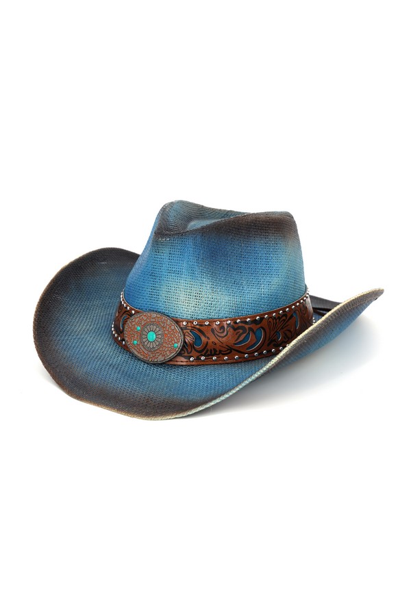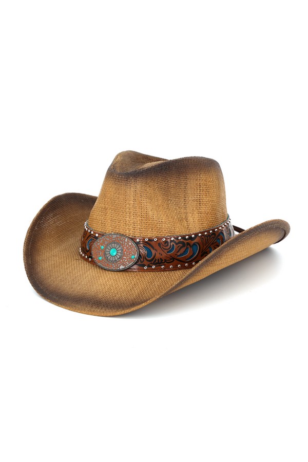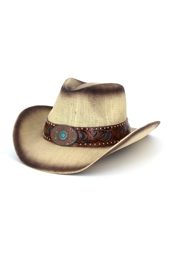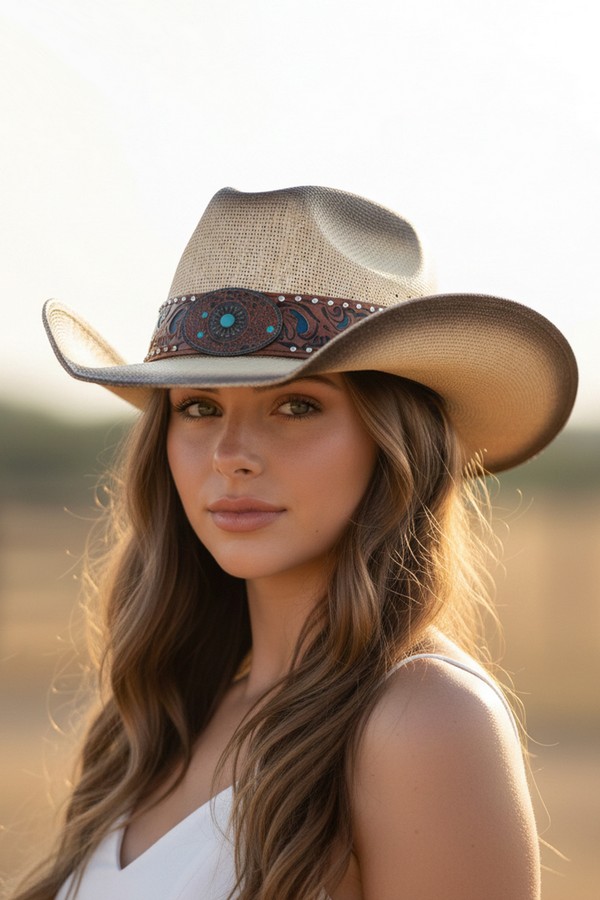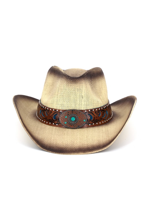 • * This Vintage Straw Cowboy Hat With Turquoise Concho Stud Band from H&D Accessories is crafted with breathable woven straw, featuring a structured indented crown and wide curved brim that embodies classic Western styling. The hat is accented by a detailed embossed band lined with metallic studs, anchored by an ornate concho with intricate metalwork and decorative inlays, adding rustic, artisanal charm. Its gently faded finish enhances the vintage aesthetic, making it a perfect accessory for rodeos, outdoor festivals, or casual country-inspired outings.
