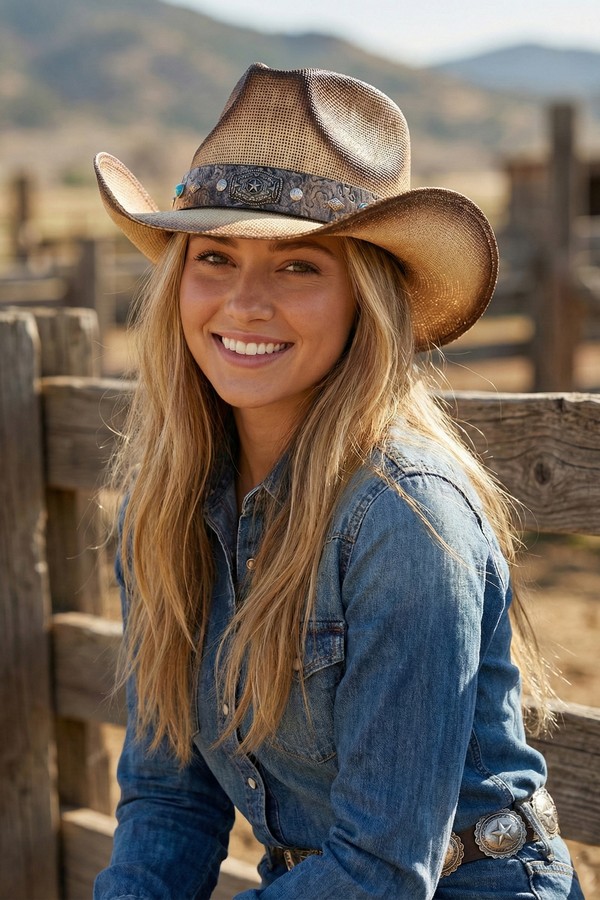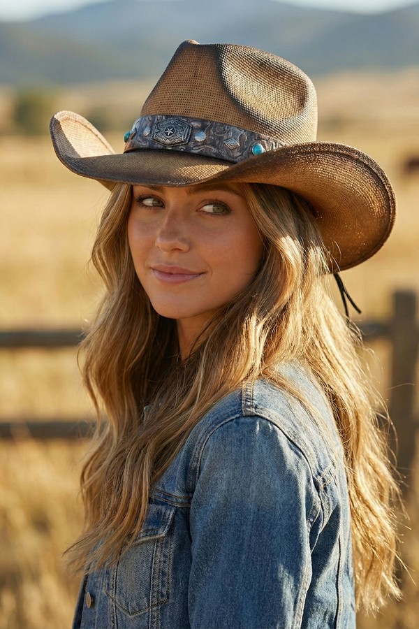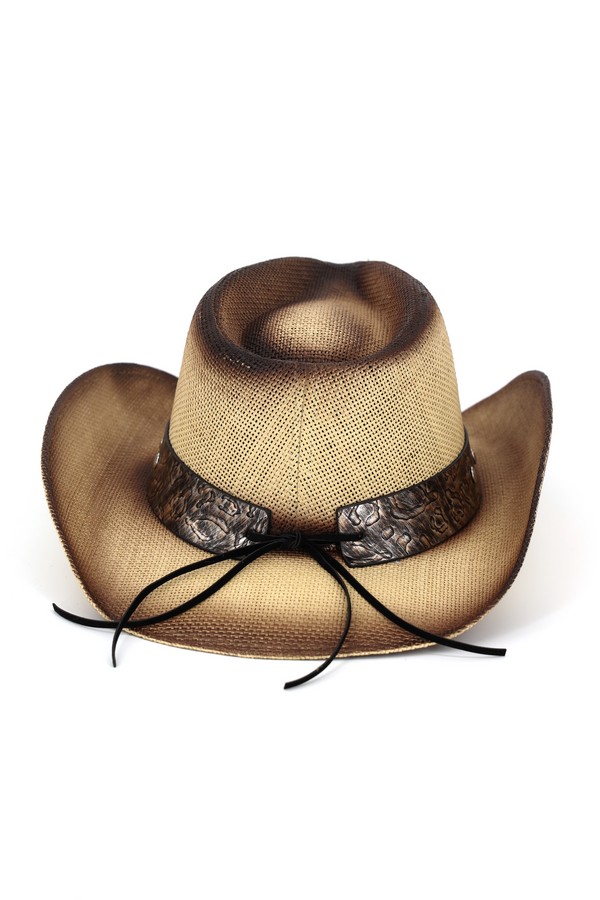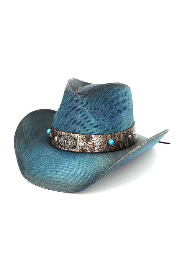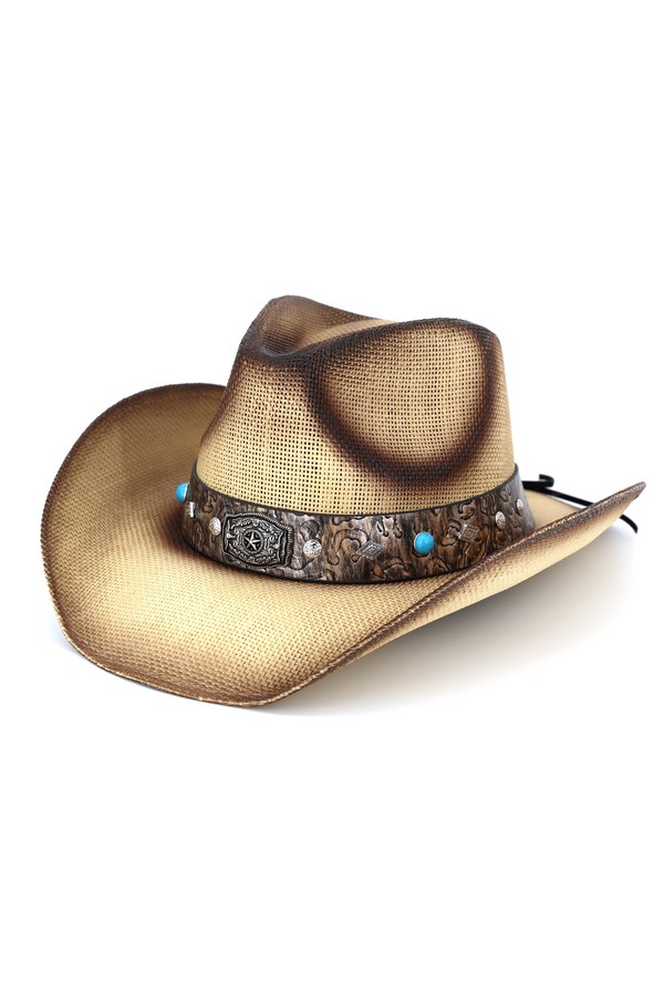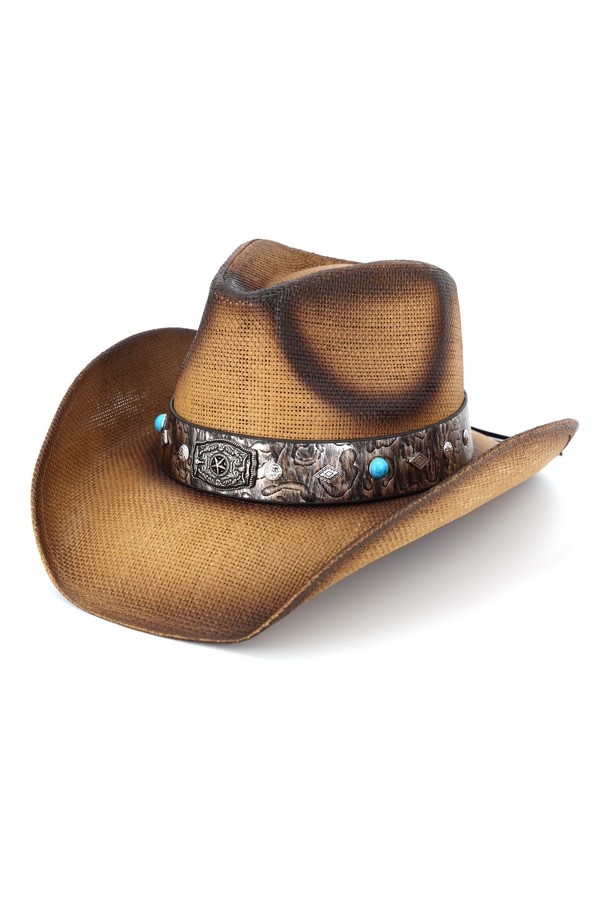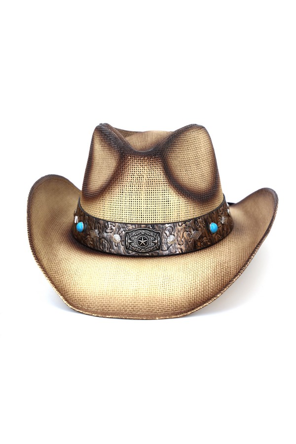 - * This Vintage Straw Cowboy Hat With Rustic Pattern Band from H&D Accessories is made of breathable woven straw, boasting a structured indented crown and wide curved brim that captures classic Western charm. Its textured band features embossed patterns, round decorative beads, and a central ornate metal badge with detailed engravings, while small metallic accents add extra rugged flair. The gently faded finish enhances its vintage appeal, making it ideal for rodeo events, outdoor concerts, or casual countryside adventures.