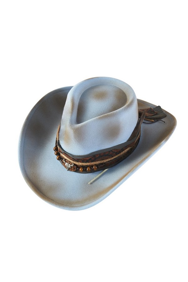 • * This is a Vintage Versatile Shapeable Cowgirl & Fedora Hat With Feather & Distressed Fabric Band from H&D Accessories. It has a distinctive design that can be shaped into a cowgirl hat or a fedora, ensuring great versatility. Decorated with a feather, a distressed fabric band, and beaded details, it emits a strong vintage aura. You can wear it when traveling to a western-style ranch to showcase a classic cowboy look, or match it with a casual denim outfit for a fashionable, retro appearance when hanging out in a downtown cafĂ©.