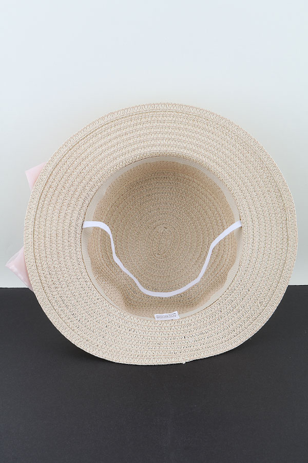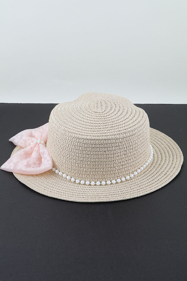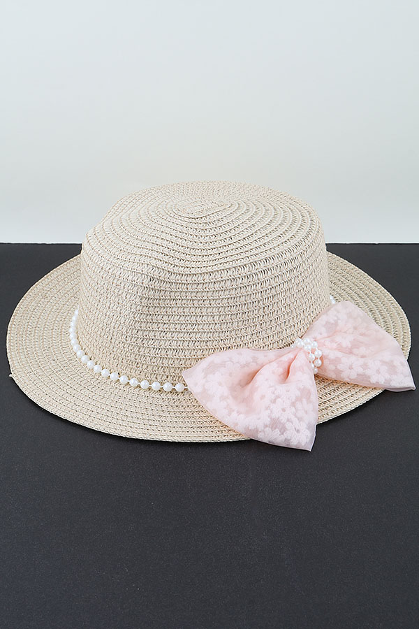 - * This KIDS Pearled Ribbon Sun Hat from H&D Accessories exudes a sweet and elegant charm. Crafted from woven straw, it presents a light beige hue, offering a natural and summery feel. A delicate string of white pearls encircles the hat, adding a touch of sophistication. Complementing the pearls is a large, soft - pink bow with a subtle pattern, tied gracefully on the side, which enhances the hat's adorable and girly aesthetic.