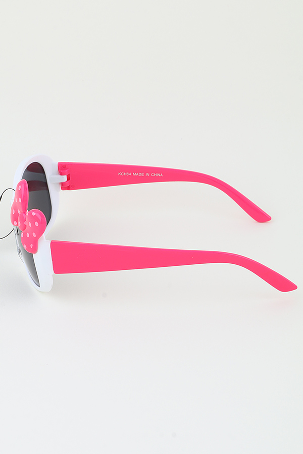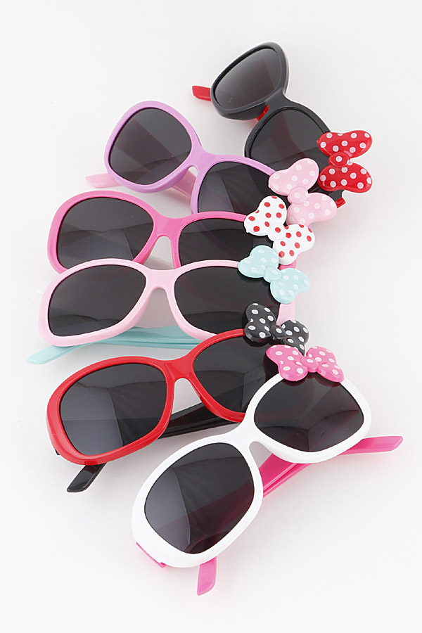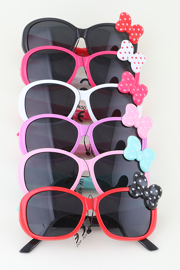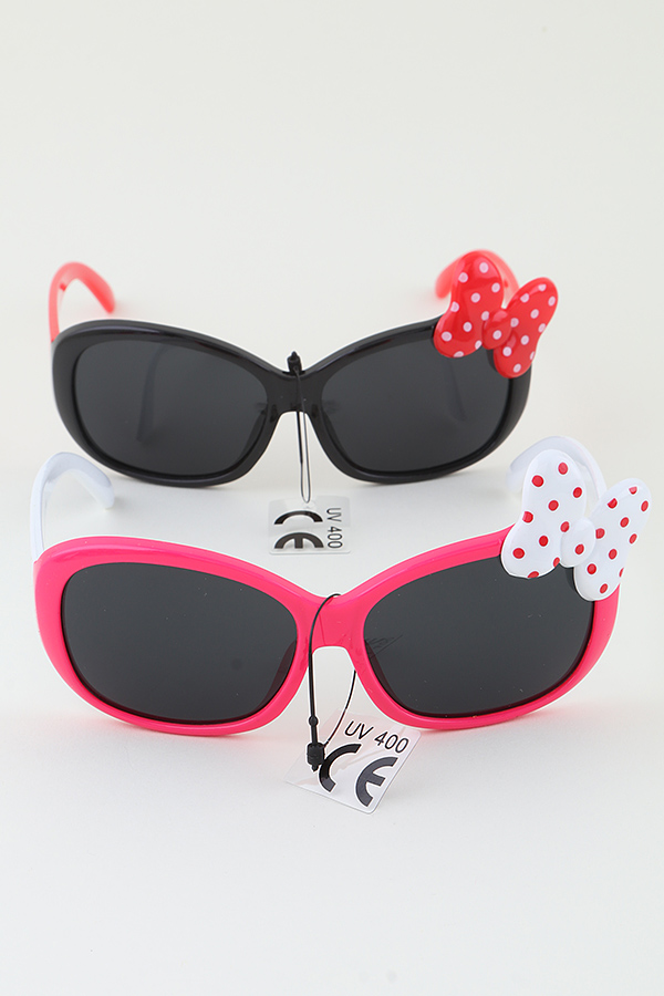 - * These are KIDS Two Toned Ribbon Sunglasses from H&D Accessories. They feature round frames adorned with cute, polka - dotted two toned ribbon decorations. Each pair comes with a tag showing "UV 400" protection, ensuring safety for kids' eyes. Perfect for children during outdoor activities like family picnics in the park, adding a sweet and stylish touch to their outfits. Great for birthday parties, beach outings, or casual strolls, letting kids look adorable while shielding their eyes from the sun.