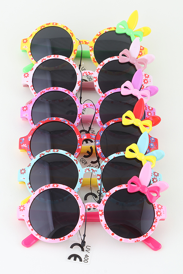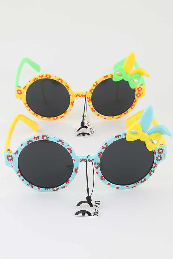 - * These are KIDS Flower Rabbit Ribbon Sunglasses from H&D Accessories. They feature round frames decorated with floral patterns and cute rabbit ribbon accents. Each pair has tags indicating "UV 400" protection, ensuring safety for kids' eyes. Perfect for kids during outdoor activities like garden parties or spring outings, adding a sweet and whimsical touch. Ideal for birthday celebrations, family picnics, or photo shoots, letting children sport an adorable, nature - inspired style while shielding their eyes from the sun.