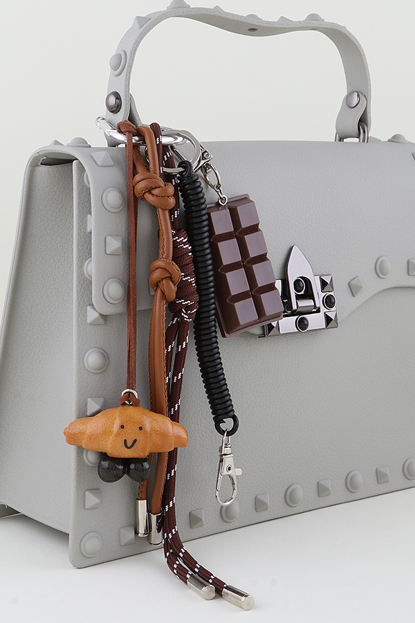 - * Happy Croissant Chocolate Tassel Bag Charm from H&D Accessories features a charming combination of a happy croissant and a chocolate - shaped charm. These delightful elements are attached to multiple tassels with diverse textures and designs. The bag charm is meticulously crafted, adding a playful and stylish touch to any bag, making it a lovely accessory for those who wish to infuse a bit of fun into their daily items.