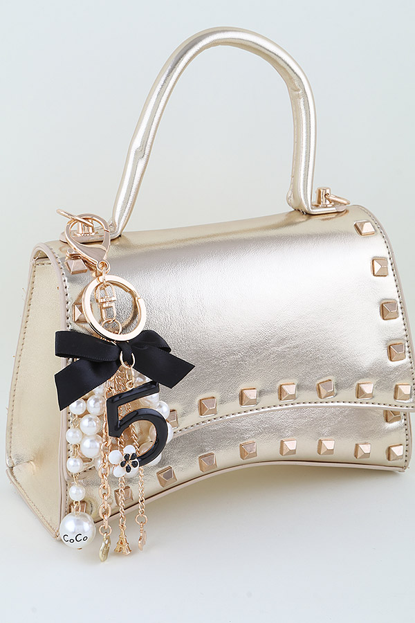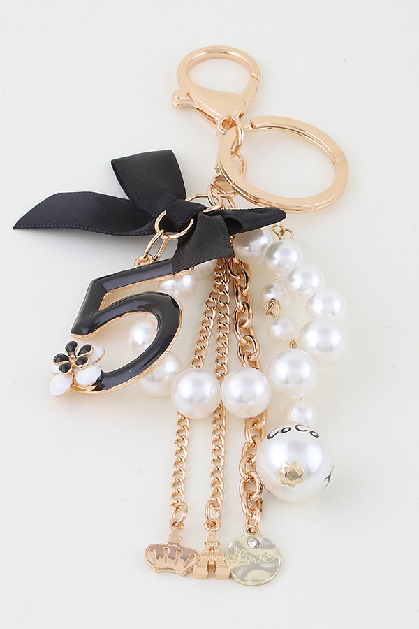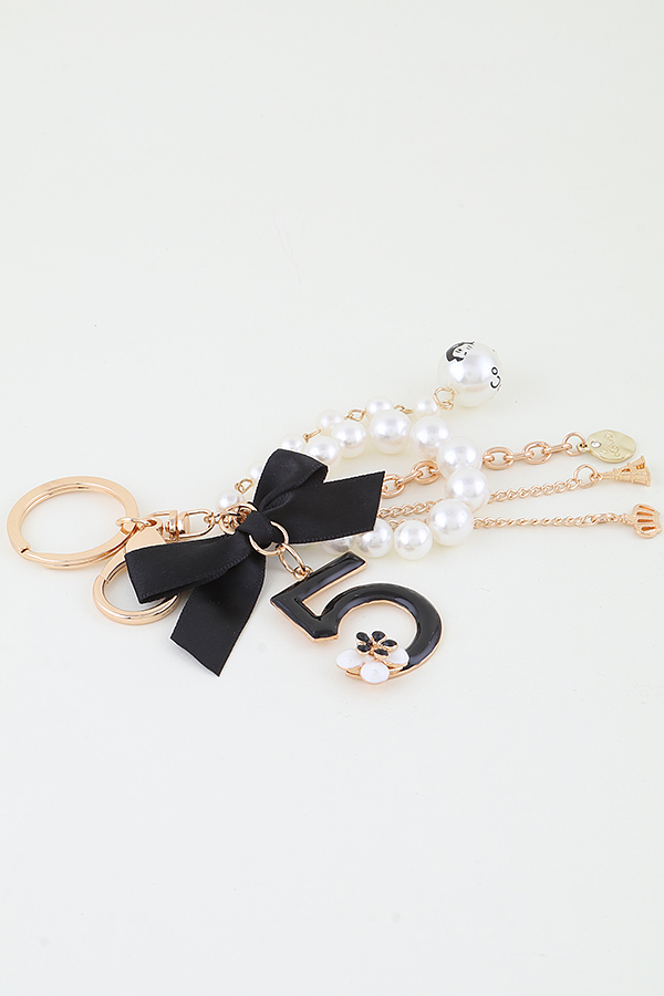 - * This Pearled 5 Drop Bag Charm from H&D Accessories is a chic and elegant accessory. It prominently features a large black "5" embellished with white pearls and a small floral detail. Surrounding it are multiple lustrous white pearls, gold - toned chains, and small decorative pendants, all tied together with a black satin bow, creating a luxurious and stylish look.