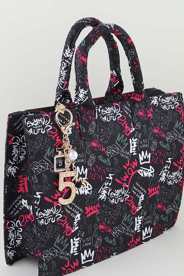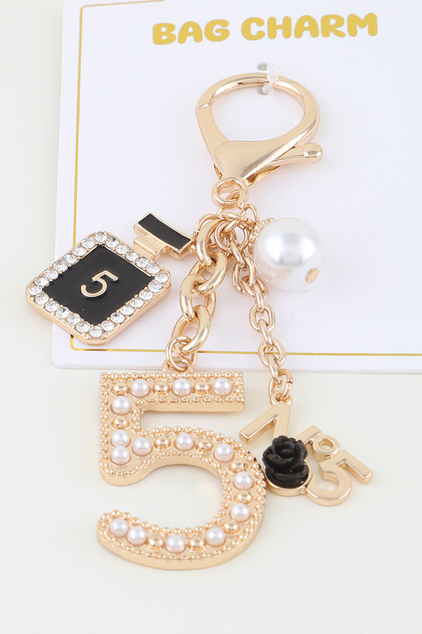 - * This Luxury Pearl Five Bag Charm from H&D Accessories is a statement piece. It features a golden clasp, connecting a series of ornate pendants. A perfume - shaped charm adorned with sparkling rhinestones and the number "5" sets an elegant tone. A lustrous pearl dangles nearby, adding a classic touch. The centerpiece is a large number "5" embellished with pearls, exuding luxury. Additionally, there's a small charm with the number "185" and a black floral detail, enhancing the charm's intricate and sophisticated design.
