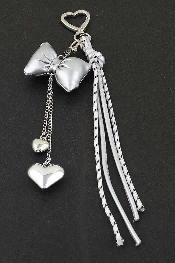 - * This Multi Stone Beaded Ribbon Bag Charm from H&D Accessories is a stylish and charming accessory. It features a metallic silver bow as the centerpiece, exuding elegance. Hanging from the bow is a chain with two heart - shaped pendants, adding a touch of romance. The charm is complemented by white beaded tassels with a dotted pattern, enhancing its trendy appeal. A heart - shaped clasp makes it easy to attach to bags or keys. Perfect for adding a fashionable and delicate touch to your everyday items. Ideal for adorning handbags for a night out or using as a keychain to liven up your keys, it's a great accessory for those who love a blend of elegance and style in their daily look.