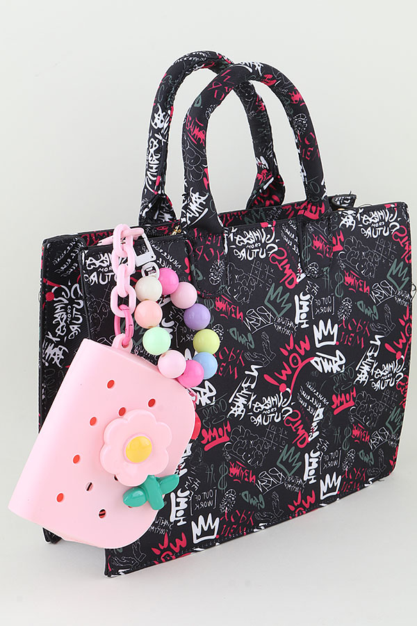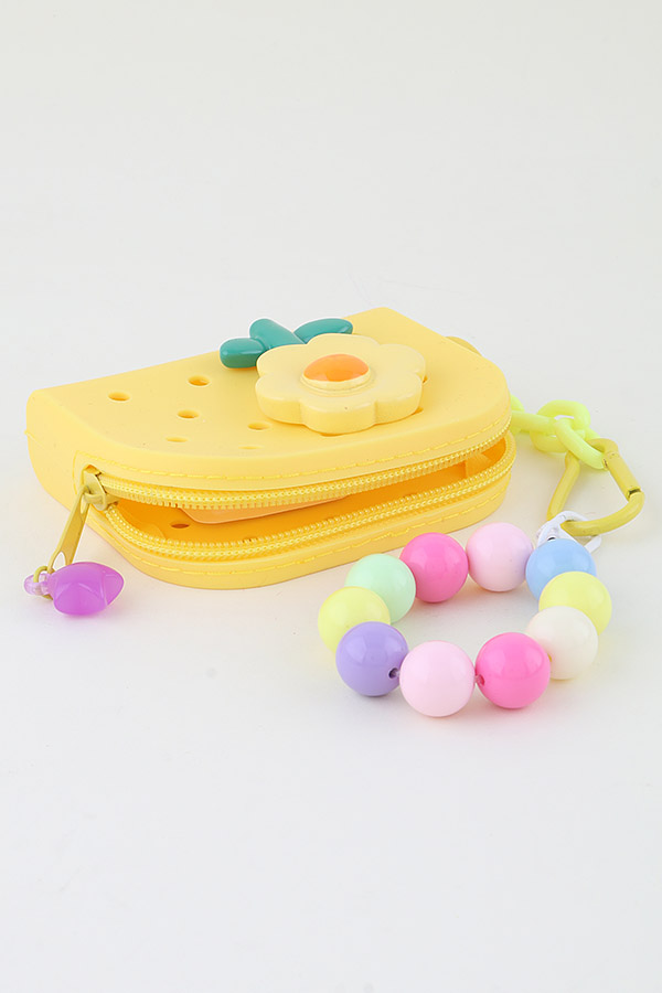 - * This is the Cute Flower Board Bag Charm from H&D Accessories. It features a small, yellow, cheese - shaped bag adorned with a charming flower decoration that has a bright center and green leaves. The bag is accompanied by a colorful beaded bracelet, and both are connected by a bright yellow chain, creating a fun and vibrant accessory