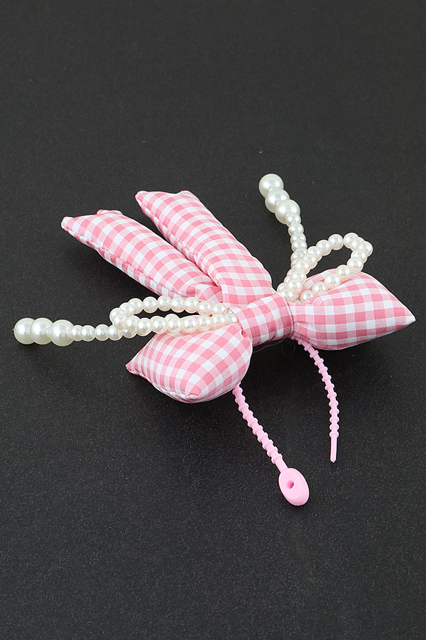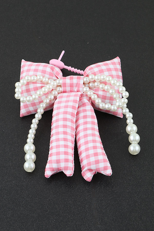 - * This is the Pearled Plaid Ribbon Bag Charm from H&D Accessories. It features a large bow made of and white checkered fabric, exuding a classic and charming look. The bow is adorned with strands of white pearls, adding an elegant and luxurious touch. The charm is attached with a pink cord, making it a stylish accessory for bags