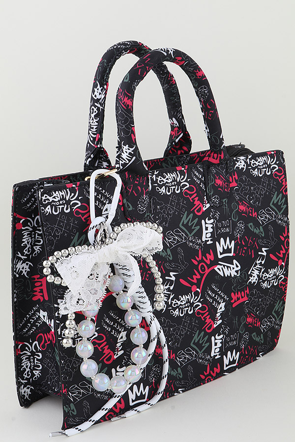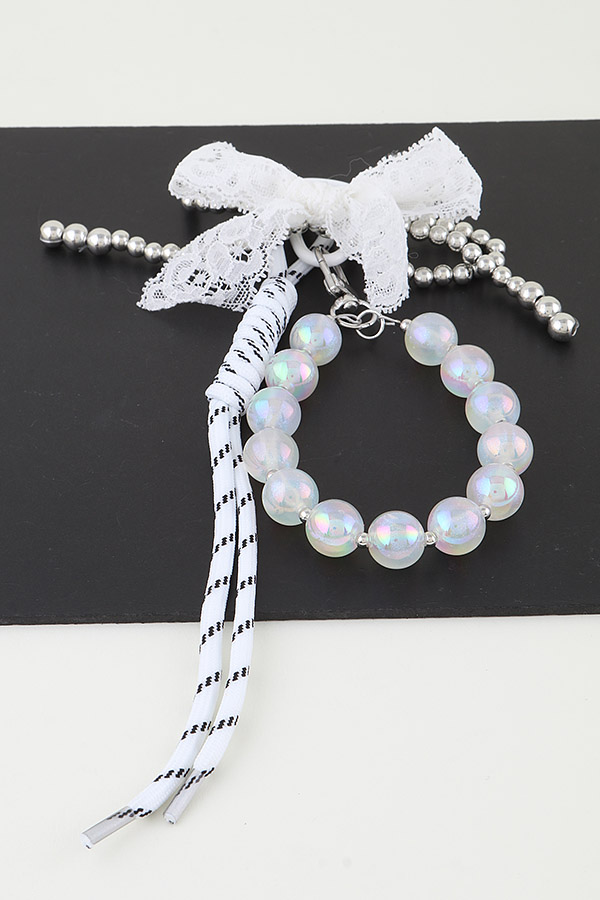 - * This is a Lace Ribbon Beaded Bag Charm from H&D Accessories. It has a lace bow, beaded chains, a string of iridescent beads, and a key ring. These elements combine to create an elegant and delicate accessory for bags.