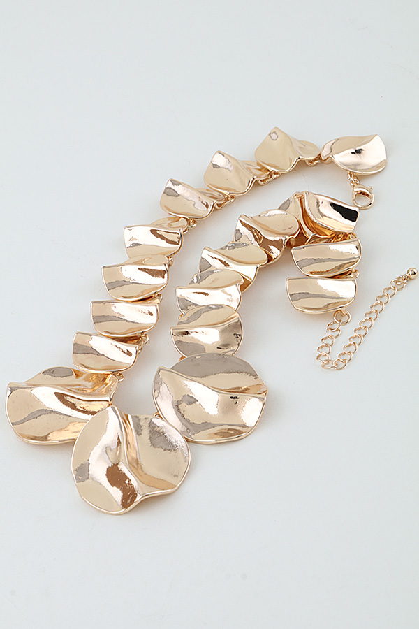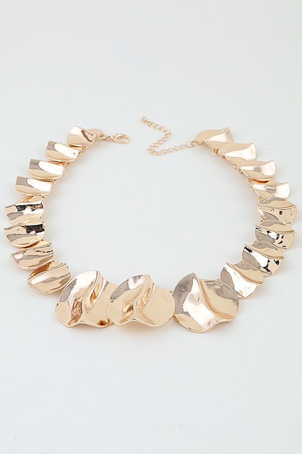 • * This Hammered Scale Chain Necklace from H&D Accessories features overlapping, textured discs with a gently rippled surface, creating a bold, sculptural collar silhouette that catches light with every movement. It pairs perfectly with a minimalist sleeveless top for a chic brunch look or adds a dramatic focal point to an evening gown, making it a striking statement piece for special occasions.