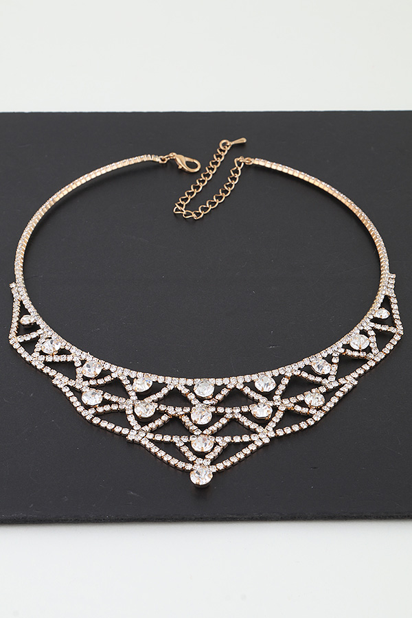 - * Multi Crystal Rhinestone Drop Necklace from H&D Accessories features an intricate, lattice - like design with numerous sparkling rhinestones. The necklace has a striking drop shape at the center, creating a glamorous and eye - catching effect. Perfect for adding a touch of luxury to evening gowns at formal events or for elevating bridal attire on weddings.