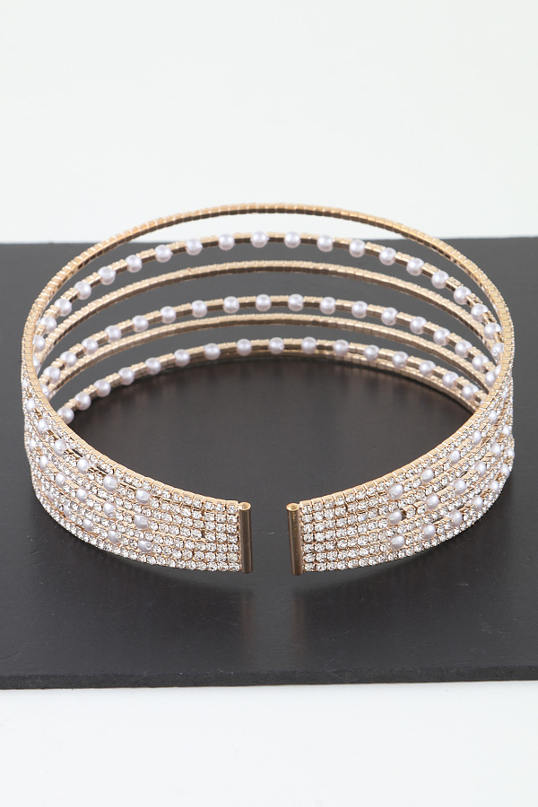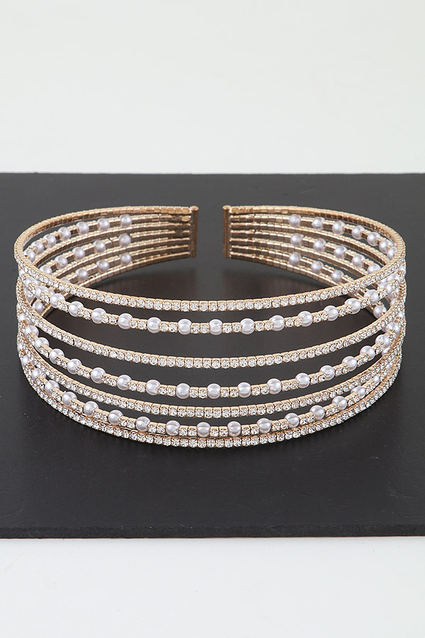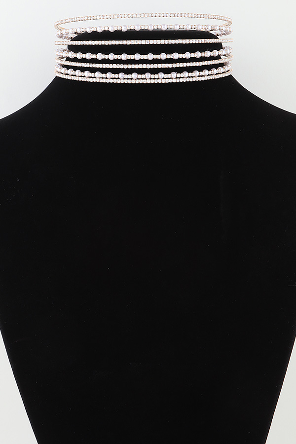 - * This is the Multi Jewel N Pearl Choker Necklace from H&D Accessories. It is an exquisitely designed piece featuring multiple layers adorned with lustrous pearls and sparkling jewels. The necklace has a sleek, continuous structure that gracefully encircles the neck, with the combination of pearls and jewels creating a luxurious and elegant look. The craftsmanship is meticulous, highlighting the harmonious blend of different elements.