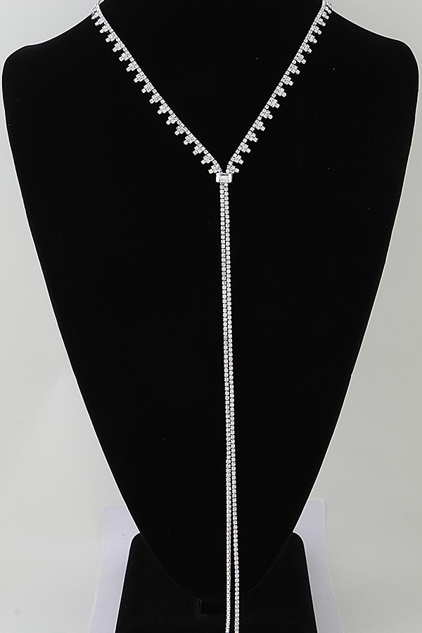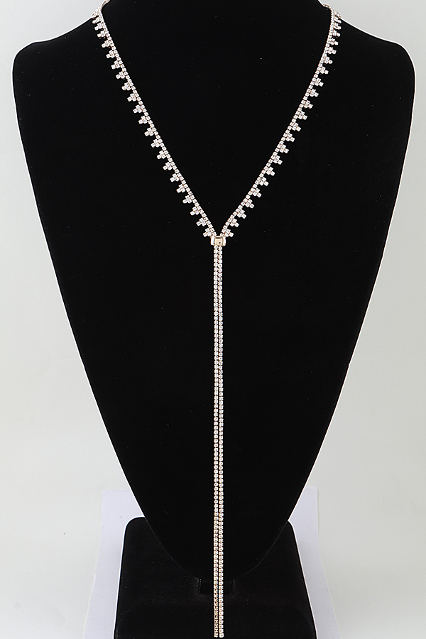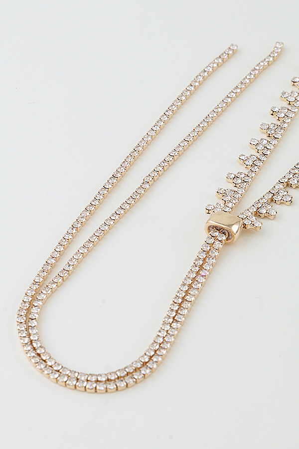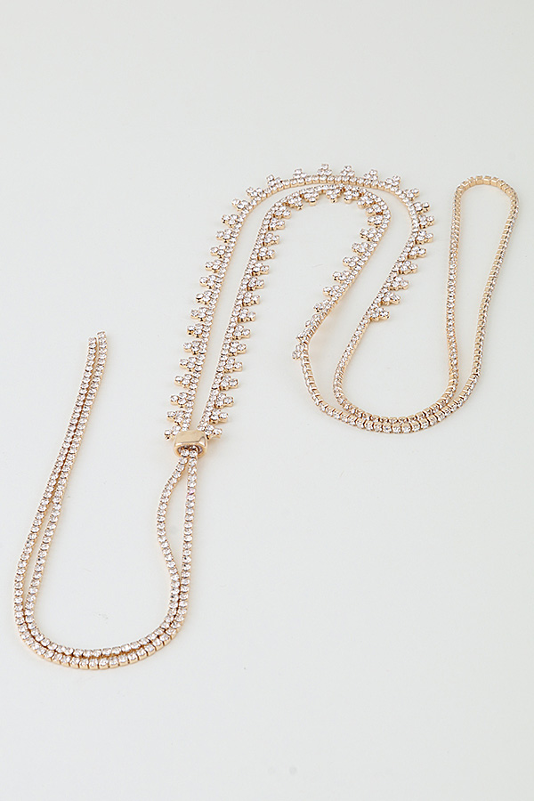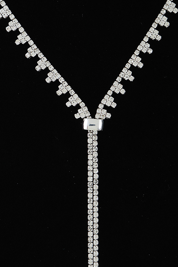 - * This is the Bejeweled Toggle Drop Statement Necklace, a striking accessory from H&D Accessories. It features a V-shaped bejeweled chain that meets at a toggle clasp, then extends into a long, cascading drop, finished with a secure closure for comfortable wear. Perfect for adding a glamorous, eye-catching touch to formal looks—whether you’re dressing up for a gala in a plunging-neck gown, a cocktail party in a sleek blouse, or a wedding in an elegant dress—this necklace serves as a bold focal point. Its structured yet dramatic design elevates sophisticated ensembles, making it a standout choice to enhance memorable, stylish occasions.