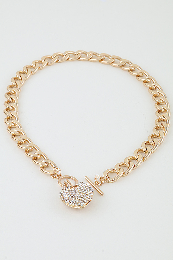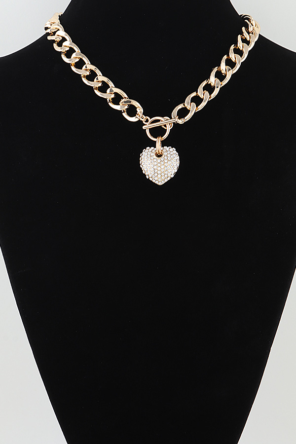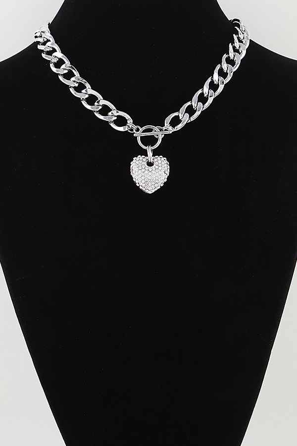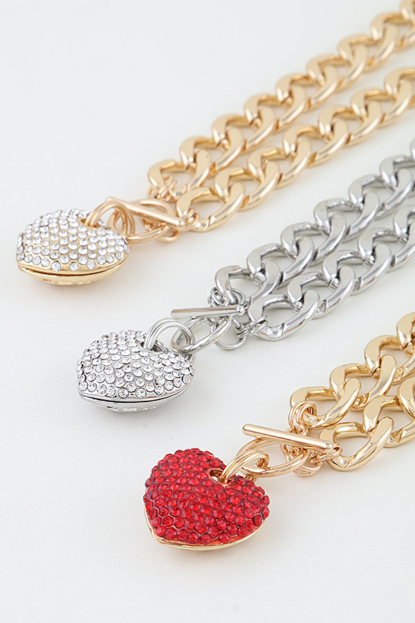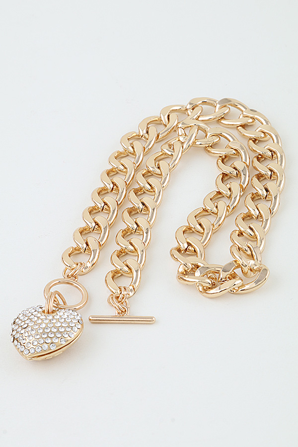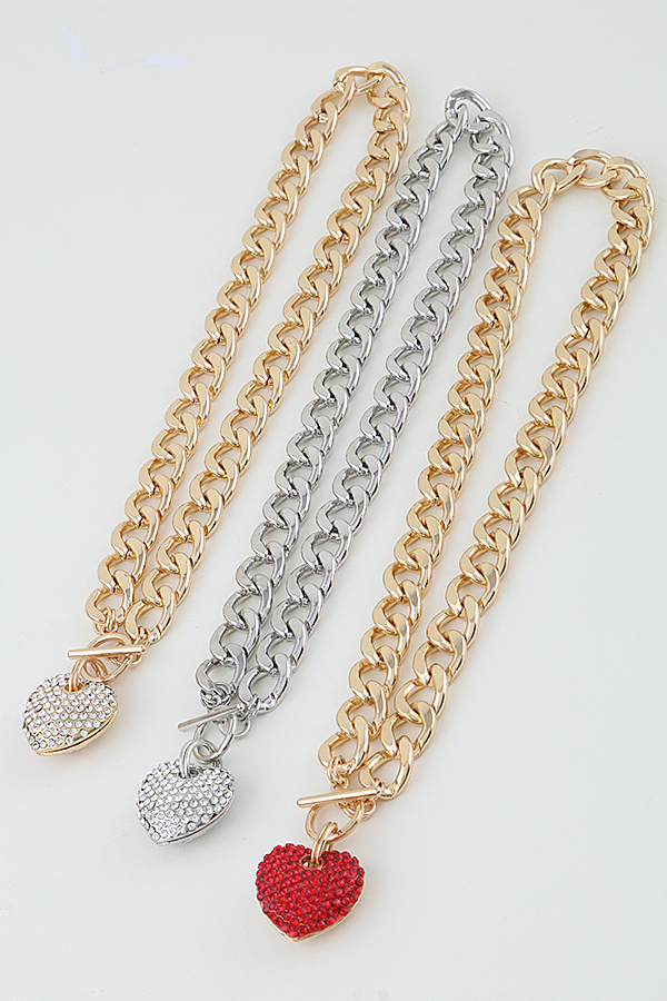 • * This Bejeweled Heart Toggle Chain Necklace from H&D Accessories features a substantial, interlocking curb chain, secured by a polished toggle clasp. Its centerpiece is a heart-shaped pendant encrusted with hand-set pavĂ© crystals that shimmer delicately with each turn of the neck. The design balances bold, statement-making structure with a soft, romantic focal point, making it an ideal pick for those who want to merge edgy and feminine aesthetics in one versatile piece.