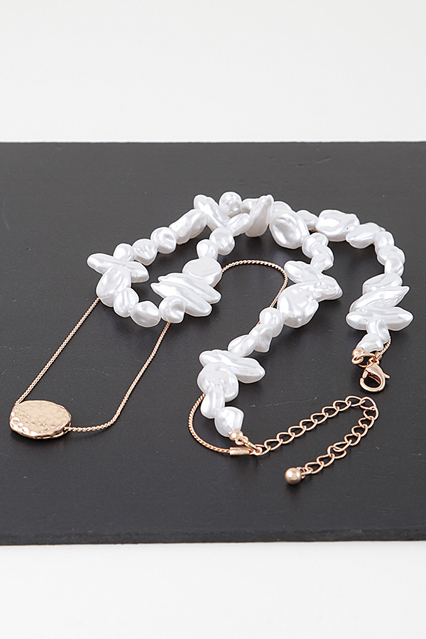 - * Introducing the "Double Abstract Stone Necklace" – a stunning blend of elegance and simplicity. This exquisite piece features lustrous white beads paired with a radiant gold disc, creating a perfect balance that enhances any outfit. Elevate your accessory game with this timeless design from H&D Accessories.