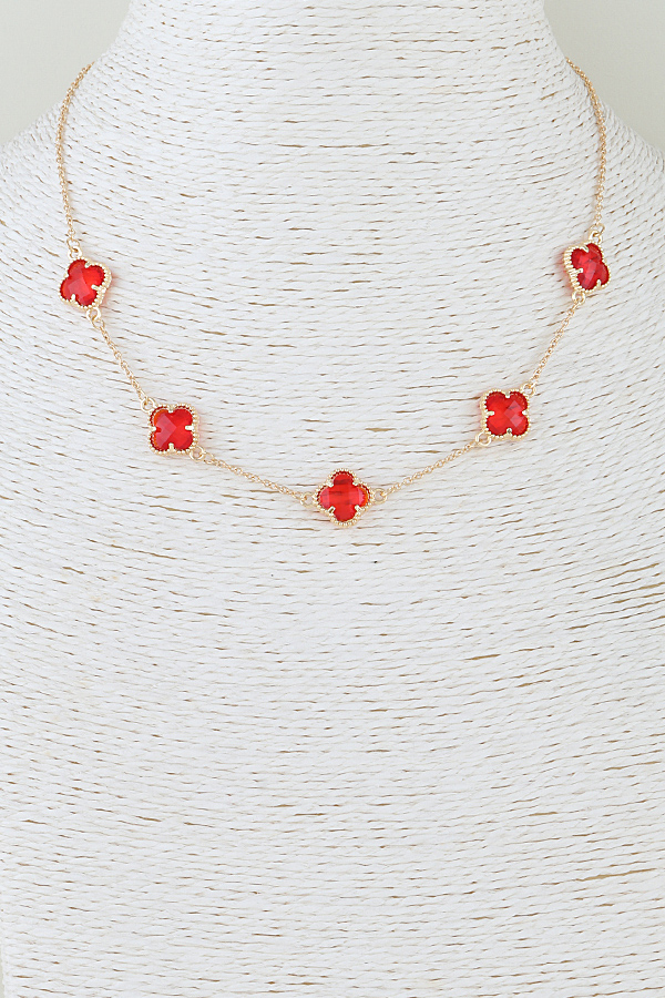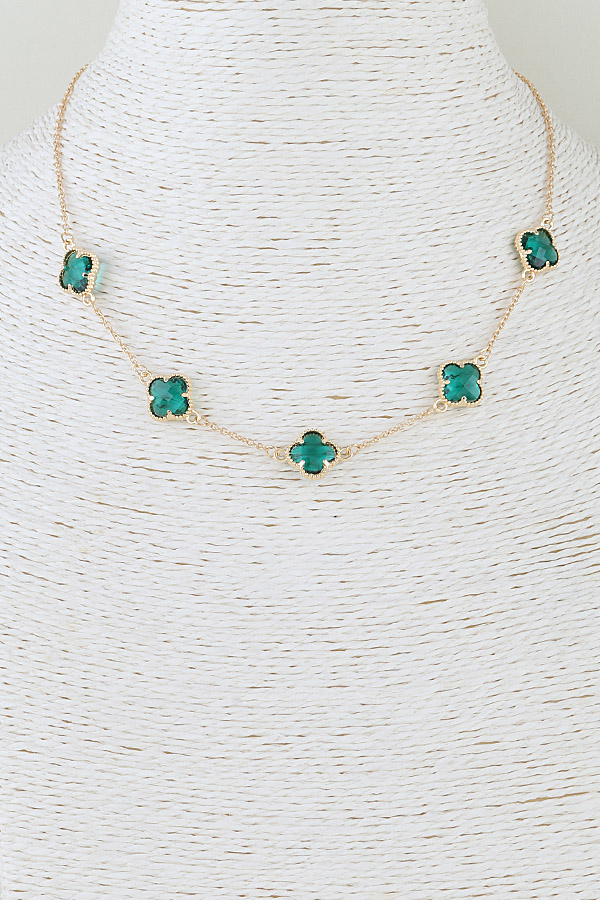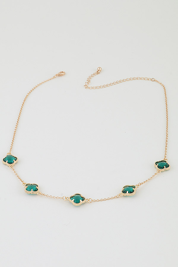 - * This necklace from H&D Accessories features a delicate, fine metal chain, adorned with five evenly spaced clover-shaped crystal charms. Each charm is set within a detailed, beaded metal frame, creating a refined, repeating pattern. The adjustable closure ensures a versatile fit, blending understated elegance with a touch of playful charm.