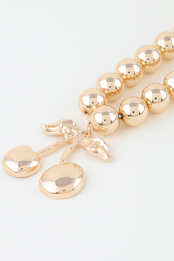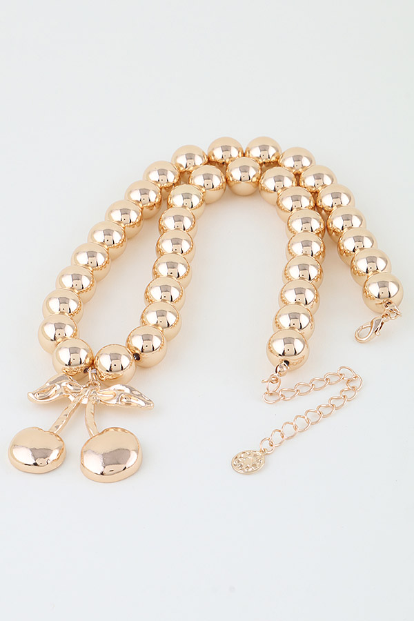 - * This Shiny Cherry Beaded Necklace from H&D Accessories is a stunning piece of jewelry. It is composed of uniformly - sized, glossy beads strung together. At the center of the necklace dangles a delicate pendant in the shape of cherries, complete with leaves, adding a touch of charm and elegance. Displayed on a black mannequin, the necklace showcases its exquisite craftsmanship and refined design.