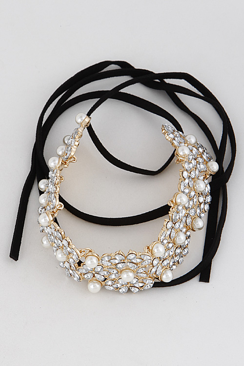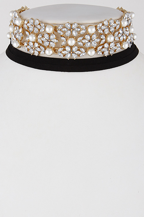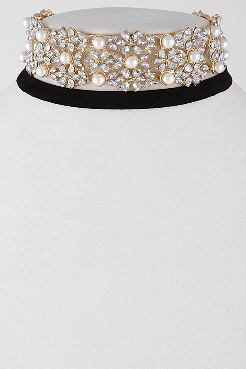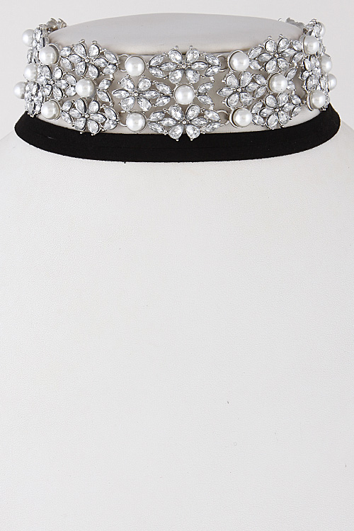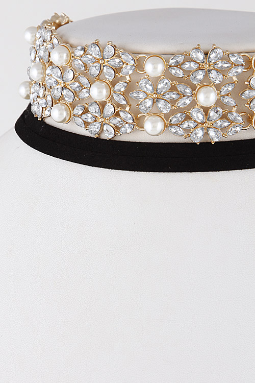 • * Flower Faux Pearl Rhinestone Choker Necklace 6KCD10 * 1.4 x 12" approx.