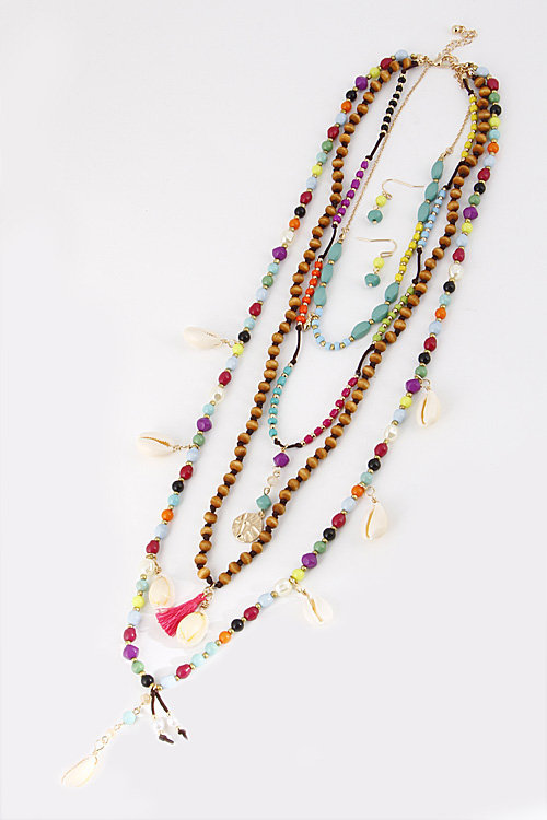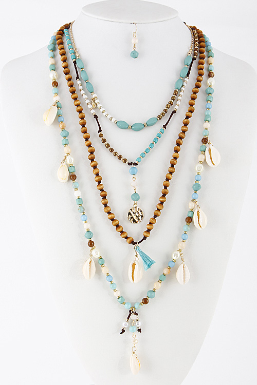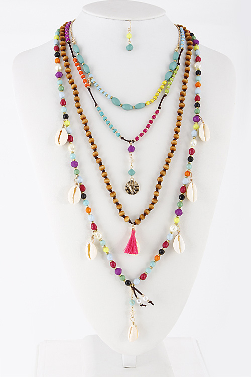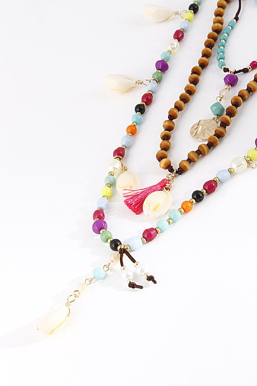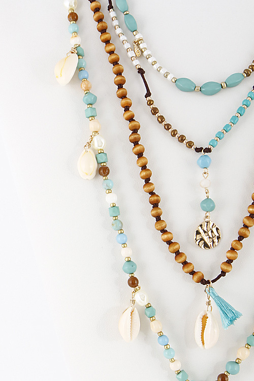 • * Four Layered Beaded Long Necklace With Shells 6CBH5 * 16" approx. * 22" approx. * 28" approx.
