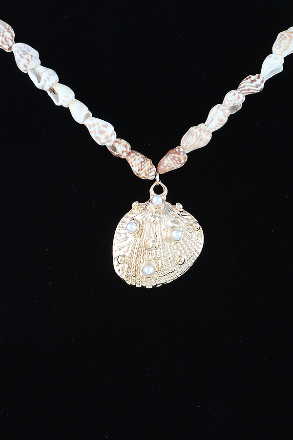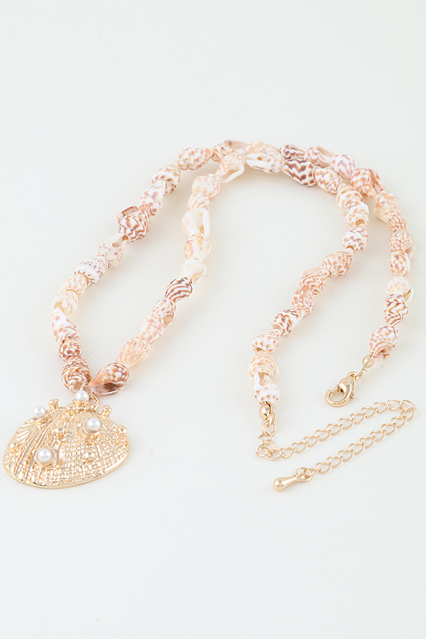- * The Pearled Sea Shell Beaded Necklace from H&D Accessories is a charming piece of jewelry. It features a large, intricately designed sea shell pendant adorned with small pearls, adding a touch of elegance. The necklace is strung with beads that resemble sea shells, creating a cohesive and stylish look. This necklace is perfect for beach vacations, summer parties, or any casual occasion where you want to add a nautical charm to your outfit.