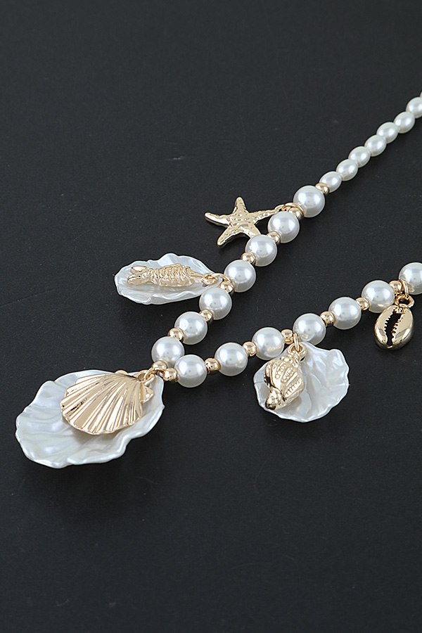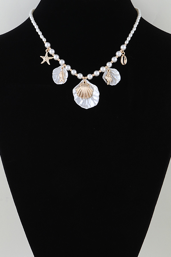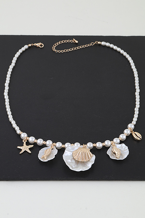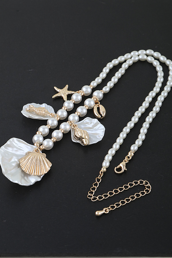 • * This Two Toned Under The Sea Beaded Necklace from H&D Accessories features a strand of lustrous beads, adorned with a variety of coastal-inspired pendants: a large, iridescent shell with a polished metallic overlay, a detailed starfish, and smaller shell accents, creating a whimsical, beachy design. Its dual-toned, nautical appearance adds a fresh, playful touch to any ensemble. Wear it to elevate a flowy sundress at a beachside brunch or to complement a lightweight blouse for a daytime event. The intricate detailing ensures a striking presence, making it a versatile choice for both casual and special occasions.