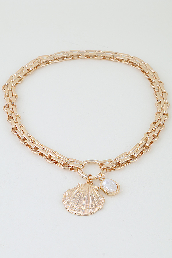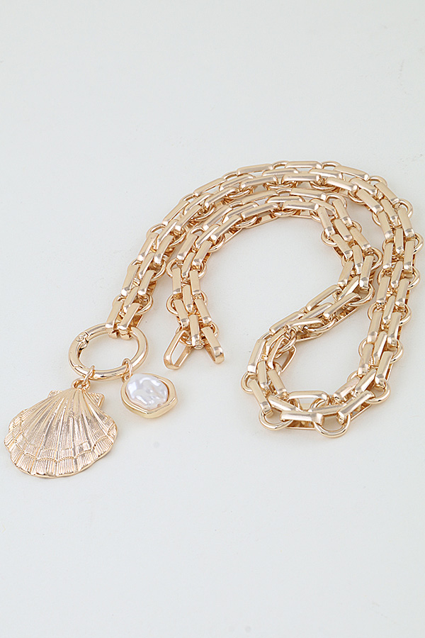 - * This Polished Seashell Pendant Toggle Chain Necklace from H&D Accessories features a chunky, metallic chain with a toggle-style clasp, anchored by two pendants: a detailed, ribbed seashell and a lustrous, irregular bead. Its coastal-inspired design adds a playful, glamorous touch to any ensemble. Wear it to elevate a flowy sundress at a beachside brunch or to complement a sleek blouse for a daytime event. The sturdy chain ensures lasting wear, making it a striking choice for both casual and special occasions.