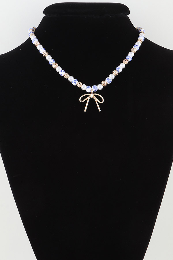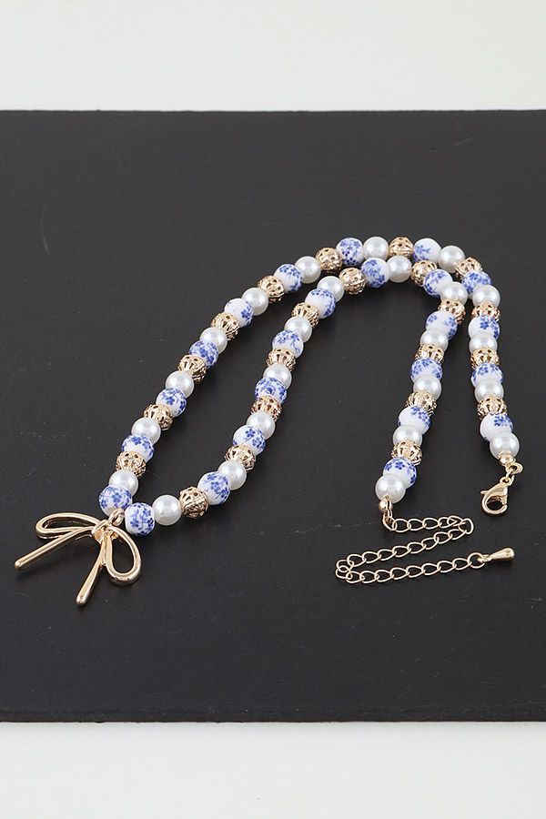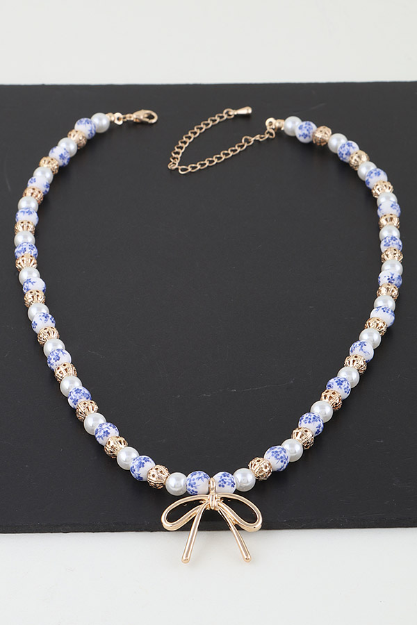 • * This Ribbon Antique Beaded Necklace from H&D Accessories is a sophisticated and elegant accessory. It features a strand of intricately designed beads, with an ornate gold - toned element interspersed among them. A delicate gold - toned bow pendant hangs at the center, adding a touch of vintage - inspired charm.