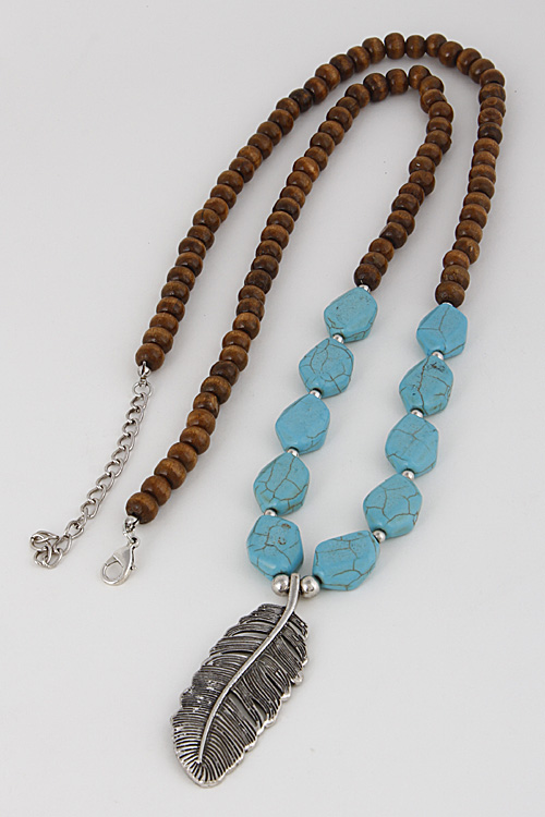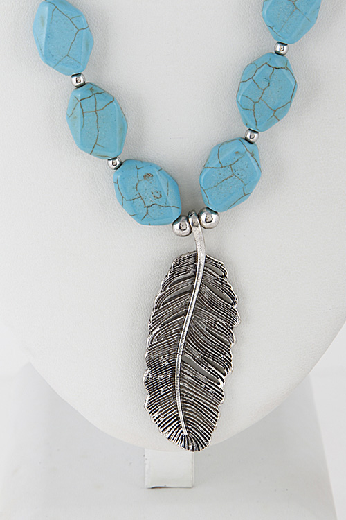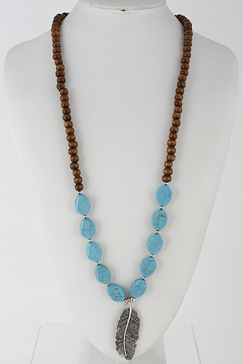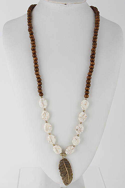 - * Long Stone Beaded Necklace With Leaf 6GCB9 * 36" approx.