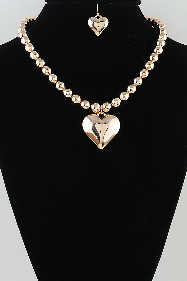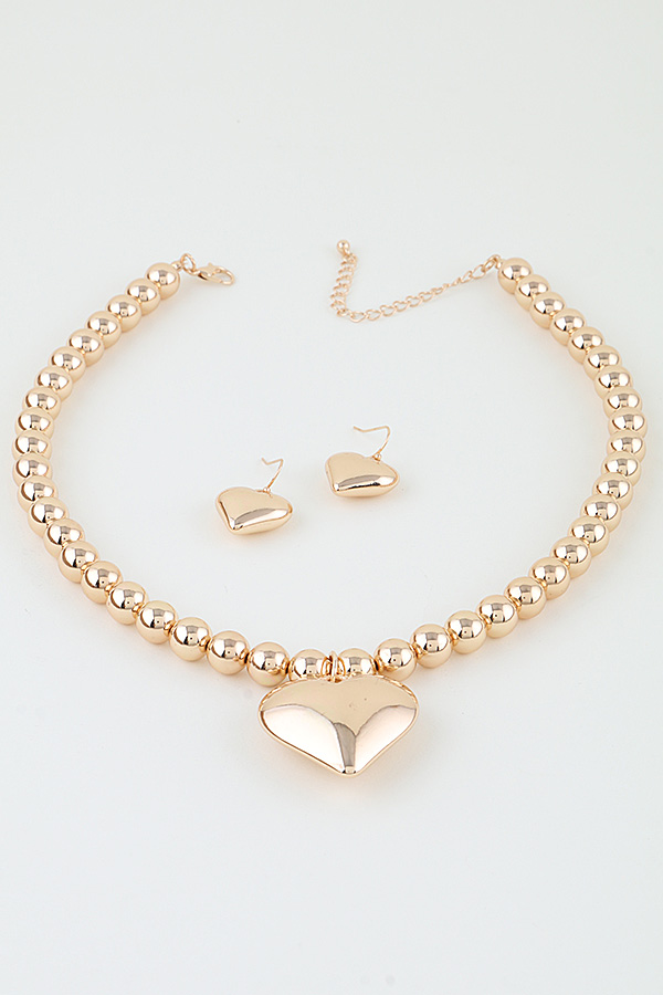 - * This Shiny Metal Heart Beaded Necklace Set (From H&D Accessories) includes a beaded necklace and a coordinating earring. The necklace features a strand of smooth, rounded beads, centered by a prominent, sculpted heart charm that adds a bold focal point. The matching earring mirrors the heart motif for cohesive styling. Designed with a polished, substantial finish, this set brings a playful yet refined touch to ensembles, blending classic heart detailing with a sleek, structured bead design.