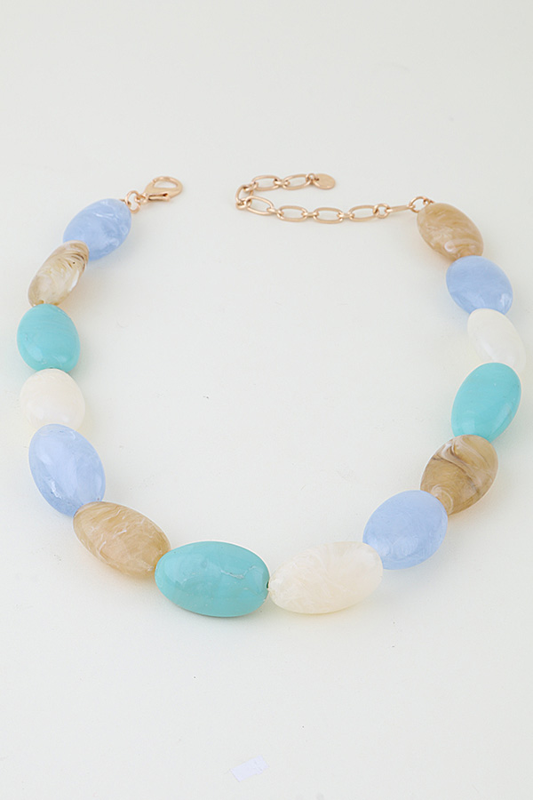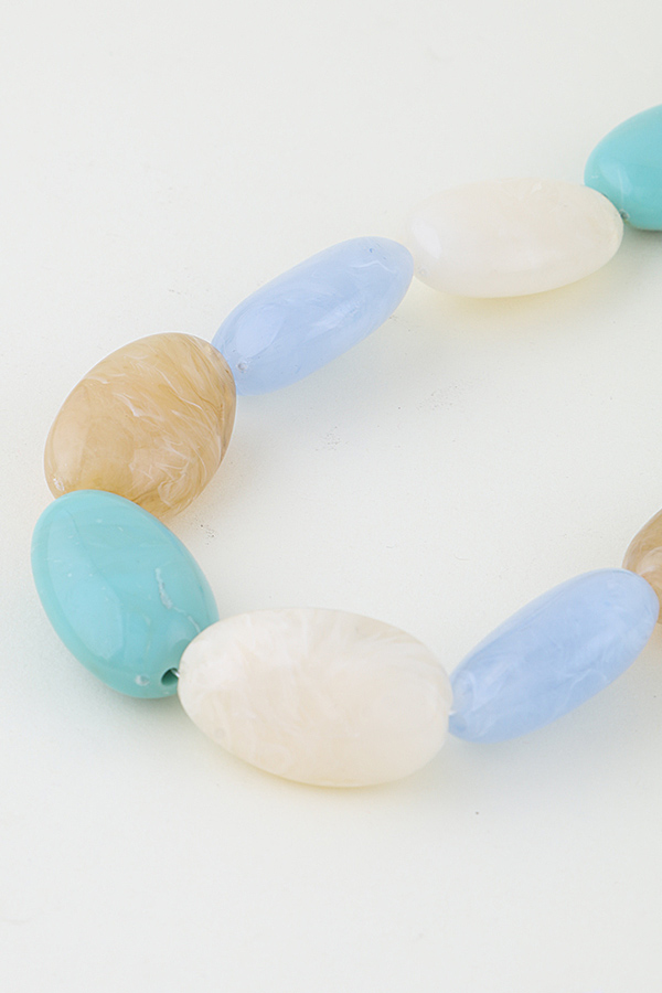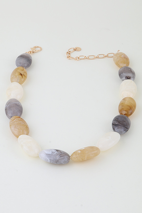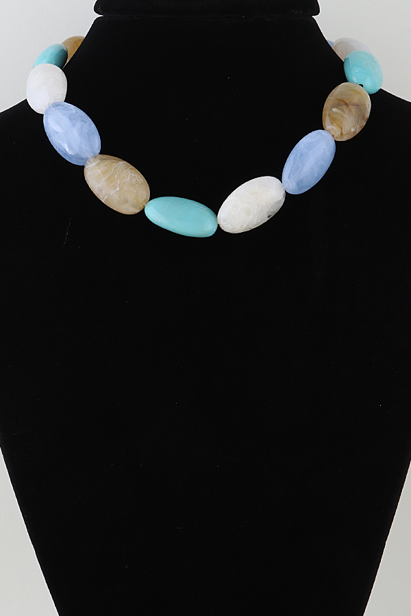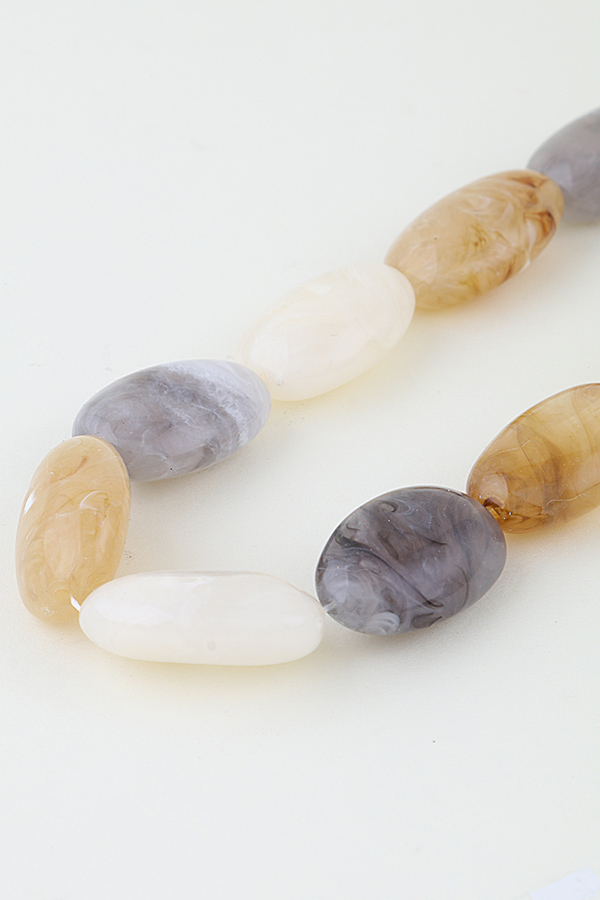 - * This Multi Marble Stone Beaded Necklace from H&D Accessories features large, oval-shaped stones with a smooth, marbled finish, strung closely for a bold, streamlined silhouette. Each stone showcases organic, fluid patterning, while the single-strand design maintains a sleek, cohesive look. Equipped with a secure closure, the necklace balances substantial, eye-catching stone size with a lightweight feel—merging natural texture with modern simplicity for a polished, statement accessory.