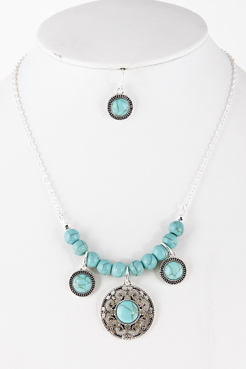 • * Turquoise Beaded Disk Charm Dangle Necklace 5CCE1 * 16" approx.